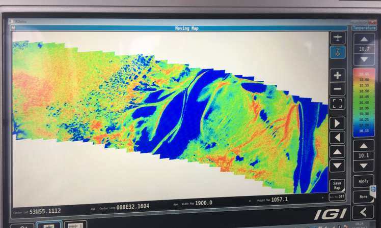 An Bord des Zeppelins befanden sich mehrere Spezialkameras. Zum einen eine Hyperspektral-Kamera, die das Lichtspektrum des Wassers aufzeichnet. Die Forscher erkennen daraus die unterschiedlichen Wasserinhaltsstoffe, wie etwa Grün- oder Braunalgen. Die an Bord installierte Infrarotkamera erstellt aus der Flughöhe von 1.000 Metern Temperaturkarten der Wasseroberfläche und erfasst dabei 50 Bilder pro Sekunde. Die Thermalkamera misst selbst kleinste Temperaturunterschiede von 0,03 Grad Celsius. Mit einer weiteren Kamera wurde die Fließgeschwindigkeit erfasst.