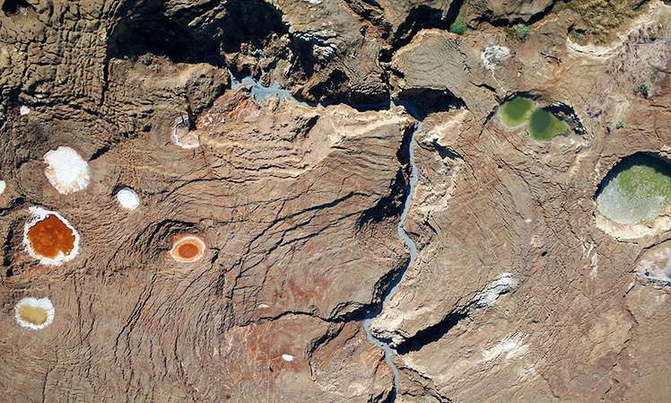 Die Bilder zeigen sowohl das Ausmaß und die Zerstörungskraft der Erdfälle, als auch die ästhetische Schönheit der dadurch geformten Strukturen und Konturen.