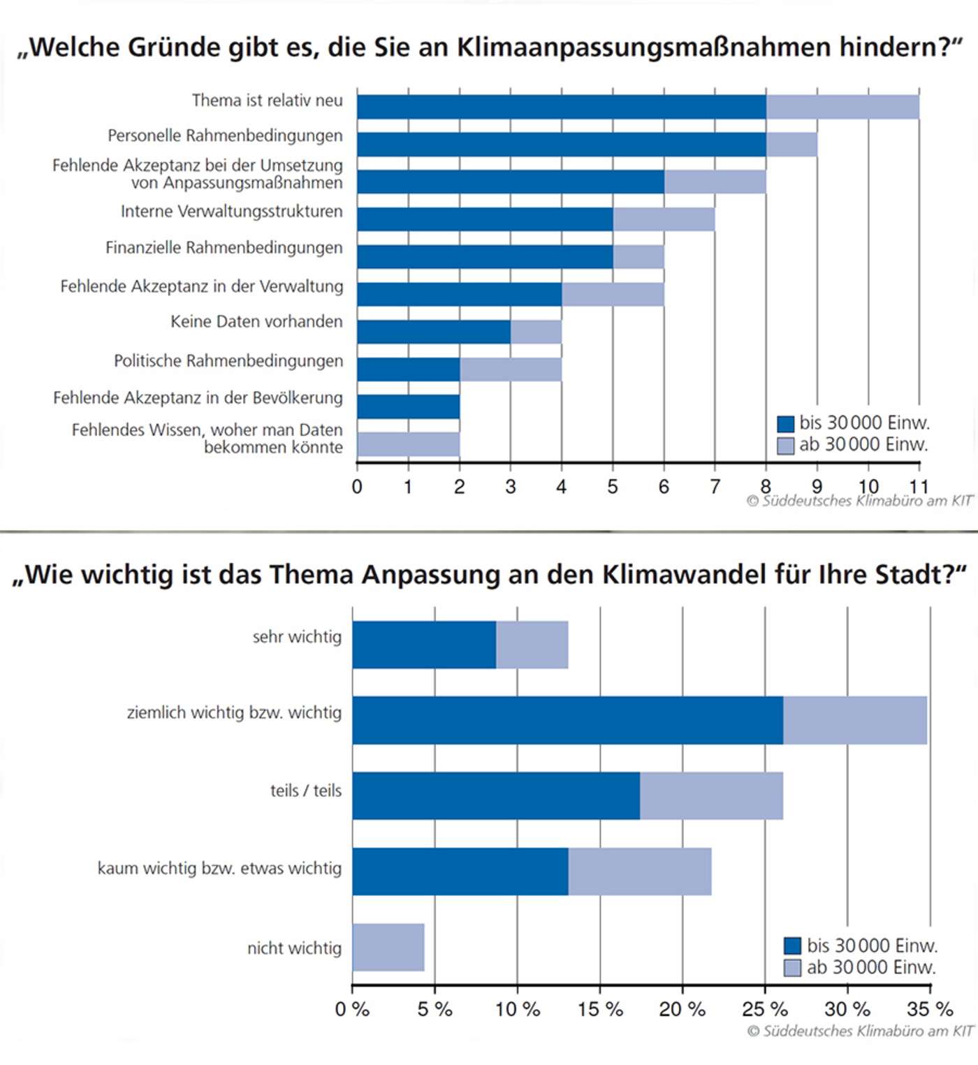Stadtverwaltungen brauchen daher für die Planung von Anpassungsmaßnahmen verlässliche Angaben über mögliche Entwicklungen des Klimas in ihrer Region. In einem Projekt des Süddeutschen Klimabüros am Karlsruher Institut für Technologien (KIT) wurden daher Stadtverwaltungen in ganz Baden-Württemberg zur Bedeutung des Klimawandels für das alltägliche Handeln befragt sowie darüber, welche Änderungen des Klimas Anpassungsmaßnahmen notwendig machen könnten. Konkrete Beispiele wurden aus den Bereichen Bauwesen, der Räumdienste, Forstwirtschaft und Personalplanung benannt. Diese Informationen und der Austausch praktischer Erfahrungen trugen zu einem verstärkten Bewusstsein für die Klimaproblematik bei den Beteiligten bei. Zudem bot das Projekt Städten einen Einstieg in die Verwendung von auf sie zugeschnittenen Ergebnissen der regionalen Klimasimulationen. Die große Bandbreite der Anwendungsmöglichkeiten kann die Entscheidungsfindung zu Anpassungsmaßnahmen an den Klimawandel unterstützen.