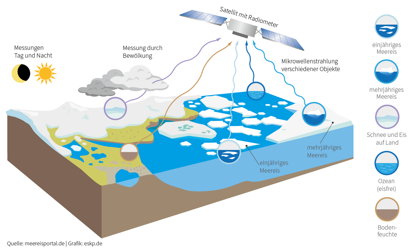 Aus diesen Gründen wird das Meereis in den Polargebieten mit Satelliten das ganze Jahr über beobachtet. Dies geschieht mit passiven Mikrowellensensoren (siehe Abb. rechts). Jedes Objekt auf der Erde gibt nicht nur Infrarot-, sondern auch Mikrowellenstrahlung von sich. Gerade im Mikrowellenbereich ist die Atmosphäre für viele Frequenzen durchlässig. In diesem Bereich kann das Meereis ohne den störenden Einfluss der Bewölkung untersucht werden. Passive Mikrowellensensoren arbeiten darüber hinaus tageslichtunabhängig, was gerade in den Polarregionen unabdingbar ist. Mikrowellenstrahlung ist zudem nicht nur an die Temperatur eines Objektes, sondern auch an sein Material geknüpft. Dadurch können Mikrowellenradiometer gut zwischen ein- und mehrjährigem Eis, sowie dem flüssigem Wasser des Ozeans unterscheiden. Aufgrund dieser Fähigkeiten liefern passive Mikrowellensensoren täglich ein nahezu vollständiges Bild der Meereisbedeckung in den Polargebieten. Sie sind sehr gut geeignet, einen weiträumigen Überblick über die globale Meereisbedeckung zu geben, zeitlich stark variable Prozesse im Meereis zu verfolgen und ermöglichen, langfristige Veränderungen in der Meereisbedeckung aufzuspüren.