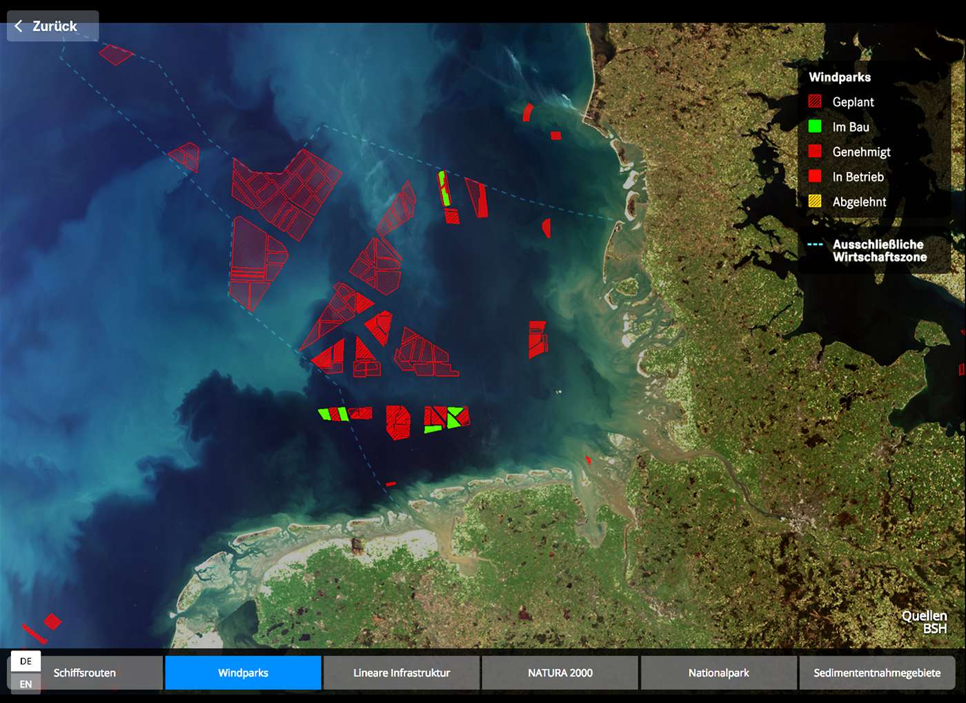 Precipitation, for example, deposits large quantities of mercury from the air into the sea. This mercury comes from burning coal and waste. The North Sea is also one of the most travelled water bodies in the world. The ships here emit large quantities of soot particles, nitrogen oxides and sulphur dioxides, which are deposited into the sea from the air. In addition, input from industry and agriculture is carried by rivers towards the sea. Beyond the Wadden Sea’s protected zones, a race virtually exists in which industrial branches are vying for the greatest claim to utilisation of the North Sea. Is it the offshore wind industry, which alone could build up to 9000 wind turbines in the German economic zone of the North Sea? Or is it the fishing industry, which can no longer pursue its activities in the wind park regions because fishing is prohibited there and they must look for fishing grounds elsewhere? What happens if large quantities of sand are removed from the coastal region for construction purposes? With the CoastMap App, users can ride in a digital elevator from the atmosphere down to the bottom of the sea and appraise their understanding of the North Sea.