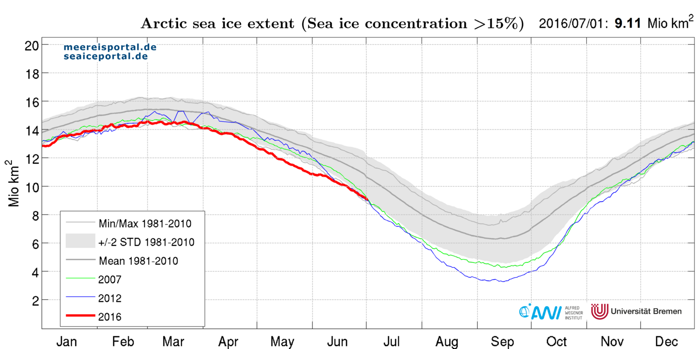 For comparison the median Outlook value for September 2016 sea ice extent is 4.28 million square kilometers with quartiles of 4.10 and 4.63 million square kilometers (more information). Contributions are based on a range of methods: statistical, dynamical models, estimates based on trends, and two informal polls. The June Outlook is based on 3 heuristic contributions (two from informal polls), 14 contributions using statistical methods (including estimates based on trends) and 13 using dynamical models, 8 of which were fully-coupled climate models.