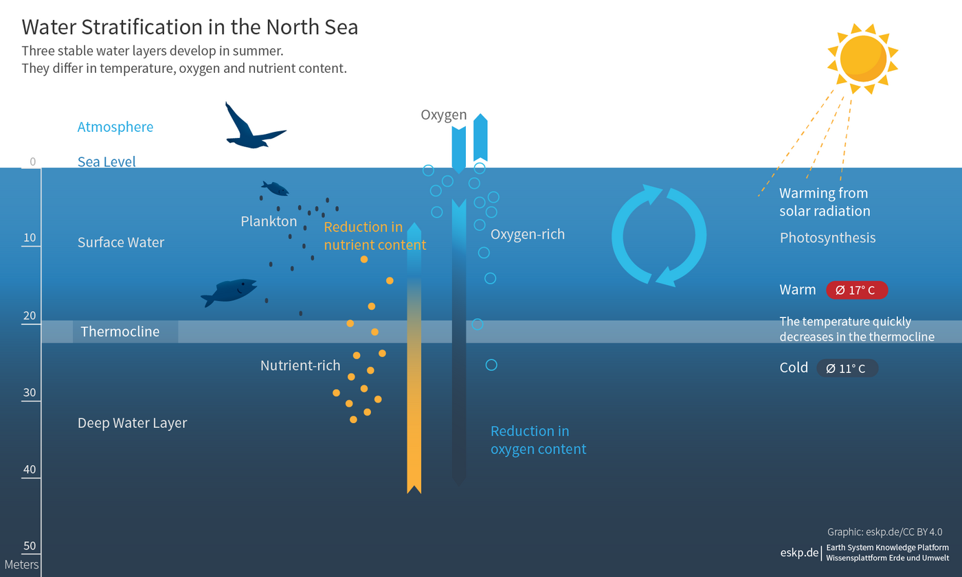 We ask the researchers: "What would happen if there was increased mixing of the warm and cold water layers?"Jeffrey Carpenter sees many processes strongly affected by the existence of stratification in the North Sea. "This includes the transport and suspension of sediment in the water column when the sediment floats by. Another effect could concern the growth of phytoplankton that serves as a vital source of food for many species. In addition, the concentration of dissolved oxygen is important and, of course, so is the water surface temperature," the researcher explains. In his view, these "could lead to a cascade effect for the ecosystem if the food spectrum for other species changes abruptly and they lose their food source." Currently, not much is known within the research field. What is known, however, is that the North Sea is an extremely dynamic and variable system. Depending on how conditions develop over the course of the year, strong differences already exist in the stratification of seawater in the German Bight. One of the enormous tasks is to understand this variability and to grasp it in figures. "At the moment, we are dealing with quantifying the natural structure of small-scale turbulent eddies in German Bight regions that lack wind farms. This forms the basis for better assessing system changes," says Lucas Merckelbach on current state of research.