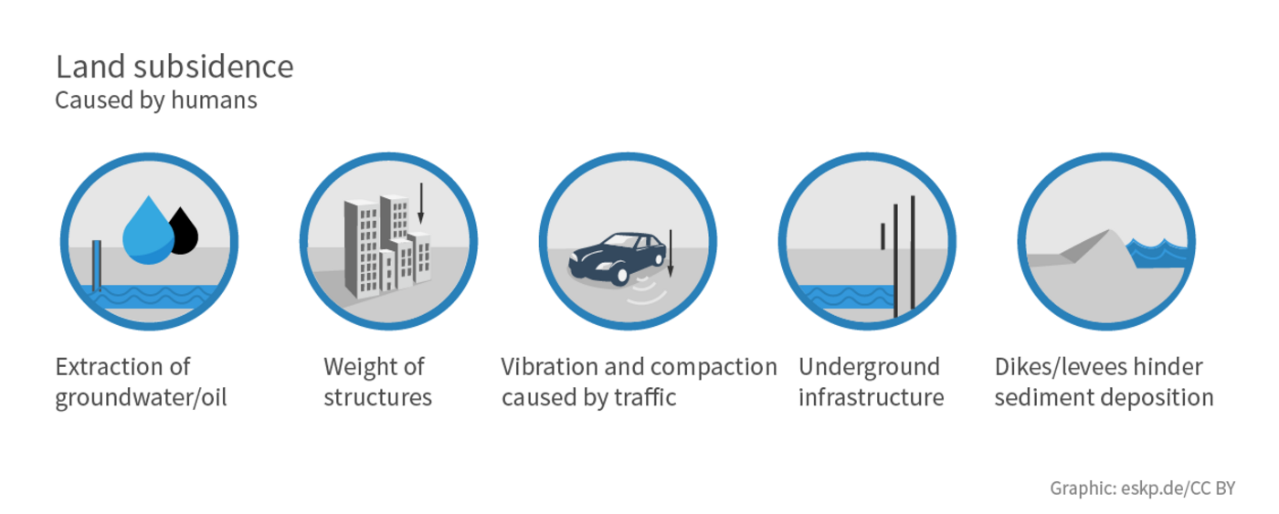 At this time last year there were areas in Jakarta that were 15 centimetres higher than they are now. One reason for this lies in the enormous amount of groundwater being pumped to the surface. This alters the pressure balances underground and can cause the ground to sink. This may occur almost unnoticed, but it can also happen very rapidly – in extreme cases at rates of up to 30 centimetres a year. Such land subsidence is above all affecting megacities located in river deltas or in coastal plains. Many people are already aware of the danger posed by rising sea levels. But local ground subsidence may prove to be a much more threatening scenario, since it involves more than just an increased risk of flooding.