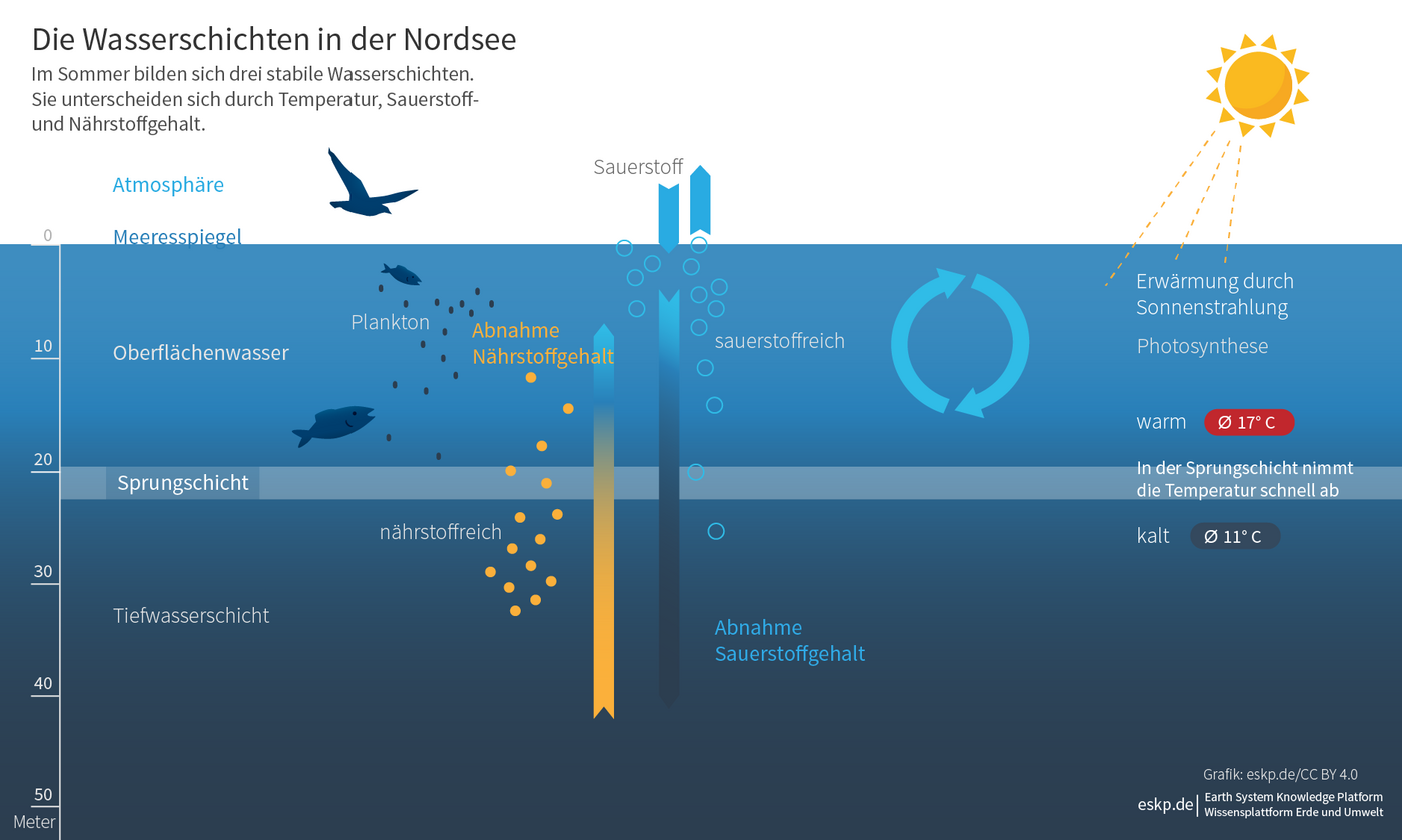 Wir fragen bei den Forschern nach: „Was würde passieren, wenn es zu einer vermehrten Vermischung der warmen und kalten Wasserschichten käme?“ Jeffrey Carpenter sieht viele Prozesse, die von der Existenz einer Schichtung in der Nordsee stark beeinflusst werden. „Dazu gehören unter anderem der Transport und die Suspension von Sediment in der Wassersäule, wenn die Sedimente dort vorbeischweben. Ebenso zählt das Wachstum des Phytoplanktons dazu, das eine wichtige Nahrungsgrundlage für viele Arten darstellt. Wichtig sind auch die Konzentration von gelöstem Sauerstoff und natürlich die Temperatur des Oberflächenwassers“, so der Forscher. Diese können seiner Ansicht nach zu einem „Kaskadeneffekt für das Ökosystem führen, wenn sich das Nahrungsspektrum für andere Arten sprunghaft ändert und diese ihre Nahrungsgrundlage verlieren.“ Darüber weiß die Forschung gegenwärtig noch nicht viel. Bekannt ist jedoch: Die Nordsee ist ein extrem dynamisches und variables System. Abhängig vom Verlauf eines Jahres gibt es in der Deutschen Bucht jetzt schon starke Unterschiede in der Schichtung des Meereswassers. Eine der großen Aufgaben ist es, diese Variabilität zu verstehen und in Zahlen zu fassen. „Momentan beschäftigen wir uns damit, die natürliche Struktur von kleinskaligen turbulenten Wirbeln – sogenannten Eddies – in Gebieten der Deutschen Bucht ohne Windfarmen zu quantifizieren. Das bildet die Grundlage, um Systemänderungen besser beurteilen zu können“, sagt Lucas Merckelbach zum aktuellen Forschungsstand.