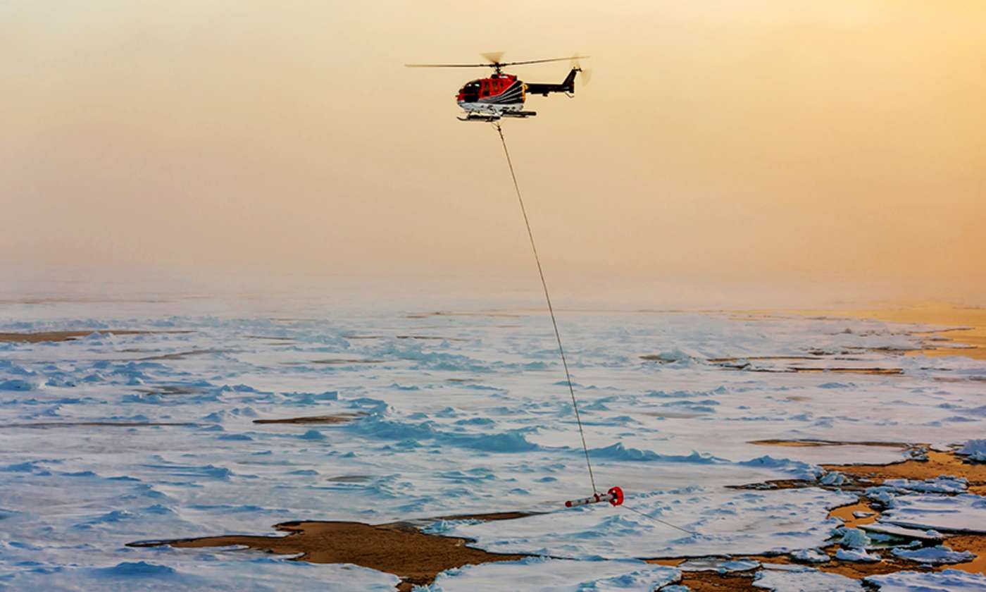 Ein solches Instrument kann sowohl auf einem Schlitten über das Meereis gezogen als auch vom Hubschrauber oder Flugzeug aus eingesetzt werden, um größere Gebiete zu vermessen. Seit 2001 verfügt das Alfred-Wegener-Institut über eine eigens entwickelte Hubschrauber-getragene Eletromagnetik (EM)-Eisdickensonde, die mittlerweile auch im Polarforschungsflugzeug "Polar-5" betrieben werden kann. Hiermit lässt sich die Meereisdicke im zentralen Bereich der Arktis, welcher im Frühjahr für Schiffe unzugänglich ist, bestimmen .