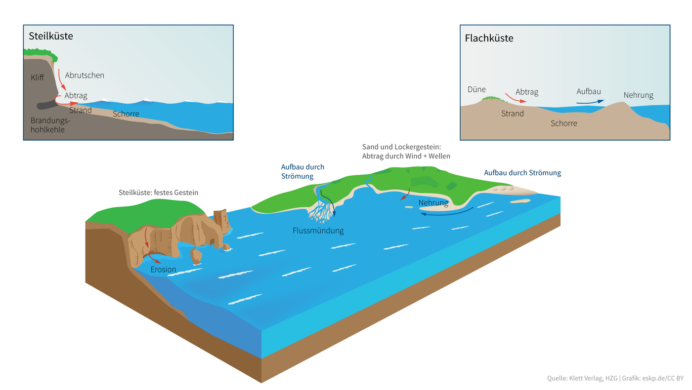 Flachküste Ostseestrand: Die Brandung an der Ostsee ist meist gering. Dennoch spült sie immer wieder Sand und Muschelschalen an den Strand. Gleichzeitig wird dieses Material auch wieder zurückgespült. Im Laufe der Zeit sind so flache Küstenbereiche entstanden.