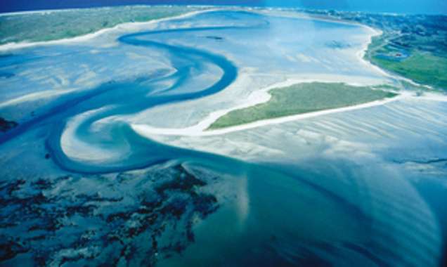 Nehrung Darß, Ostsee: Die Nehrung ist ein bekanntes Beispiel für eine Flachküste. Hier wird allerdings durch eine Strömung, die parallel zur Küste verläuft, Sand seitlich des eigentlichen Küstenverlaufs abgelagert. Auf diese Weise entstehen Sandbänke vor der Küste.