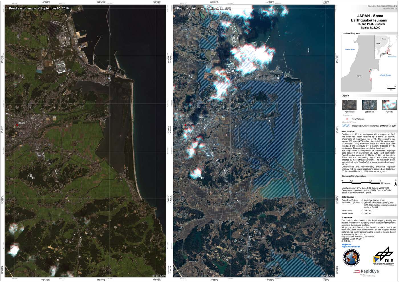Zudem lassen sich Natur- und Umweltkatastrophen mit Hilfe von Satellitenaufnahmen erfassen und nachweisen: Tankerunglücke, Abgaswolken, Hochwasser Zerstörungen nach einem Erdbeben oder schwere Waldbrände (siehe hierzu den ESKP-Artikel zur FireBird-Mission des Deutschen Zentrums für Luft- und Raumfahrt). Die gewonnen Informationen können dann Einsatzkräften in den jeweiligen Regionen schnell zur Verfügung gestellt werden. Solche Auswertungen auf Grundlage von Satellitenbildern sind von enormer Bedeutung, da das Schadensausmaß großflächig bilanziert werden kann. Zudem lassen sich Zerstörungen von wichtigen Infrastrukturen identifizieren. Dazu zählen zum Beispiel auch Informationen zu Transportwegen, um Hilfsmaßnahmen umgehend einleiten und planen zu können.