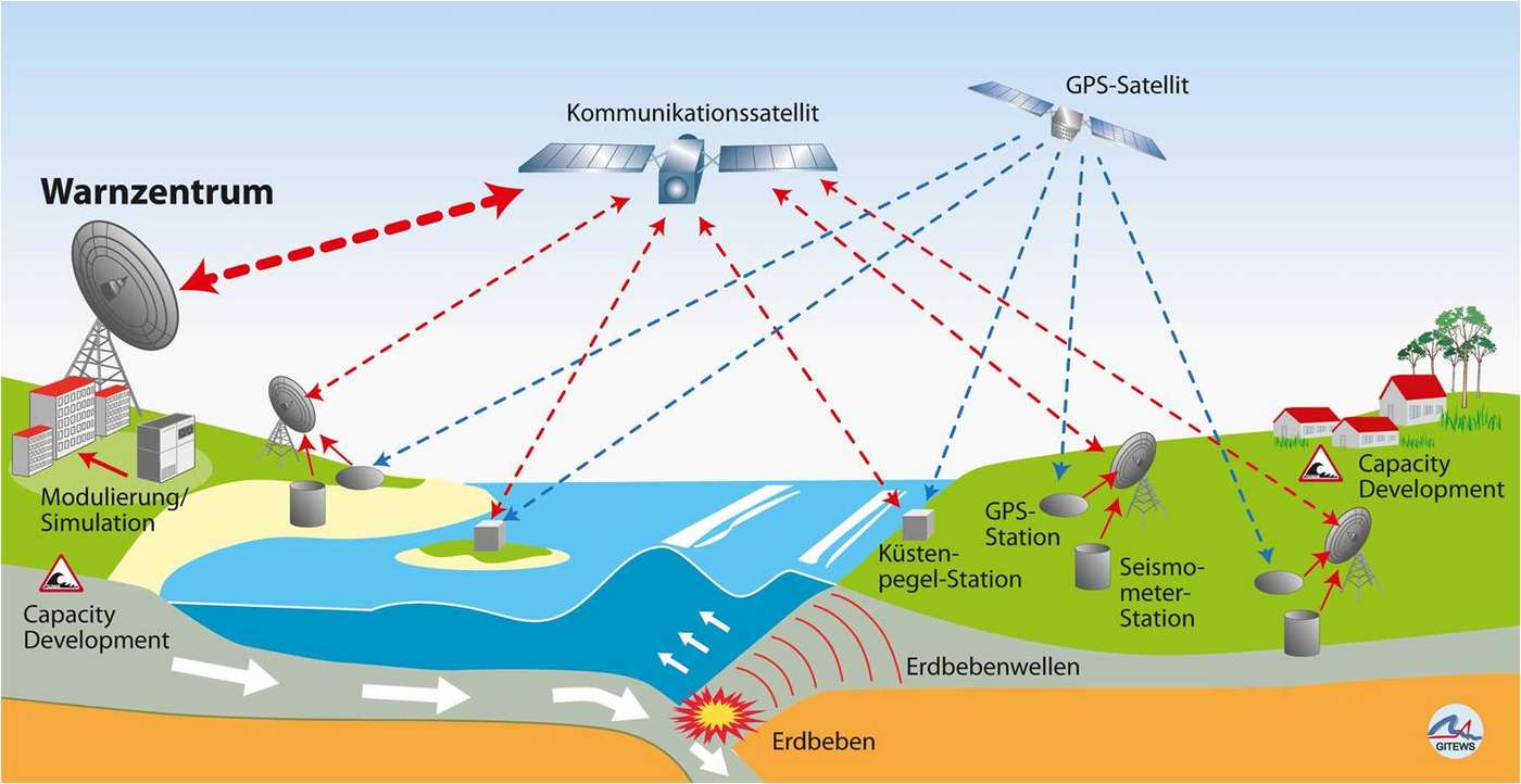 Bei einem starken Erdbeben bricht oder reißt die Erd- bzw. Meeresbodenoberfläche über etliche hundert Meter oder auch einige Kilometer auf. Entlang dieser Bruchfläche werden die darüber liegenden Wasserschichten in Schwingung versetzt. Zusätzlich zur Bestimmung der Erdbebenparameter ist die Richtung, in die der Erdbebenbruch verläuft, von besonderer Bedeutung, da anhand dessen die Wellenausbreitung erfolgen wird. Für eine genaue Ortsbestimmung werden GPS-Sensoren eingesetzt. Zusätzlich zu den Erdbeben- und GPS-Stationen liegen entlang der Küste sowie auf den vorgelagerten Inseln Pegelstationen, die den Wasserstand kontinuierlich erfassen und an das Warnzentrum senden.