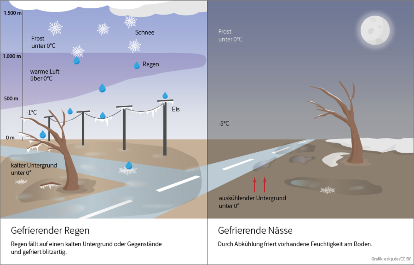 Weniger häufig sind ausgeprägte Glatteislagen. Dann kann die Kombination aus Temperaturen im Frostbereich und gebietsweise mehrere Stunden anhaltendem kalten Regen oder Sprühregen auch großflächig zu Glatteis führen. In der Folge bildet sich auf Straßen, Wegen, an Oberleitungen, an Gegenständen und selbst auf der noch vorhandenen Schneedecke eine teilweise zentimeterdicke Eisschicht.