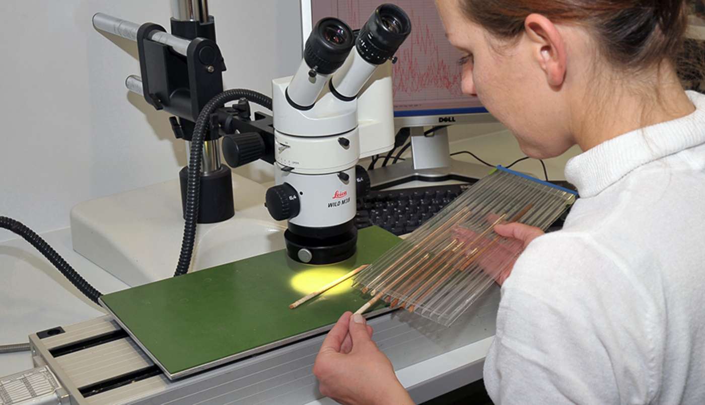Für die Daten der Jahrringbreiten, welche die Grundlage für alle weiteren Untersuchungen und Methoden bilden, werden die gezogenen Bohrkerne präpariert. Das bedeutet: Im Labor müssen die „frischen“ Bohrkerne eine gewisse Zeit trocknen und sich dem Raumklima anpassen, um Risse oder andere Probleme nach dem Aufkleben zu vermeiden. Die getrockneten Proben werden anschließend auf Probenhalter aus Holz aufgeleimt. Dabei ist zu beachten, dass die Tracheiden rechtwinklig zu ihrer Längsrichtung angeschnitten werden (Hannrup et al., 2001), um später Messfehler und Probleme bei den holzanatomischen Messungen zu vermeiden.