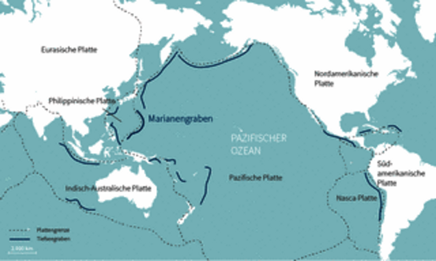Dort, wo eine ozeanische Platte auf eine kontinentale Platte trifft, entstehen Subduktionszonen, zum Beispiel rund um den Pazifischen Feuerring. Die ozeanische Kruste wird hier unter die kontinentale Kruste gezogen. Daran sind großräumig zwei Kräfte beteiligt: Zum einen schieben die Mittelozeanischen Rücken die ozeanische Kruste vom Spreizungszentrum weg, und somit auf eine andere Platte zu. Zugleich sinkt im Kontaktbereich der beiden Platten die ozeanische Kruste nach unten. Dies wird durch ihre höhere Dichte sowie durch die Konvektionsströme im Mantel bewirkt.