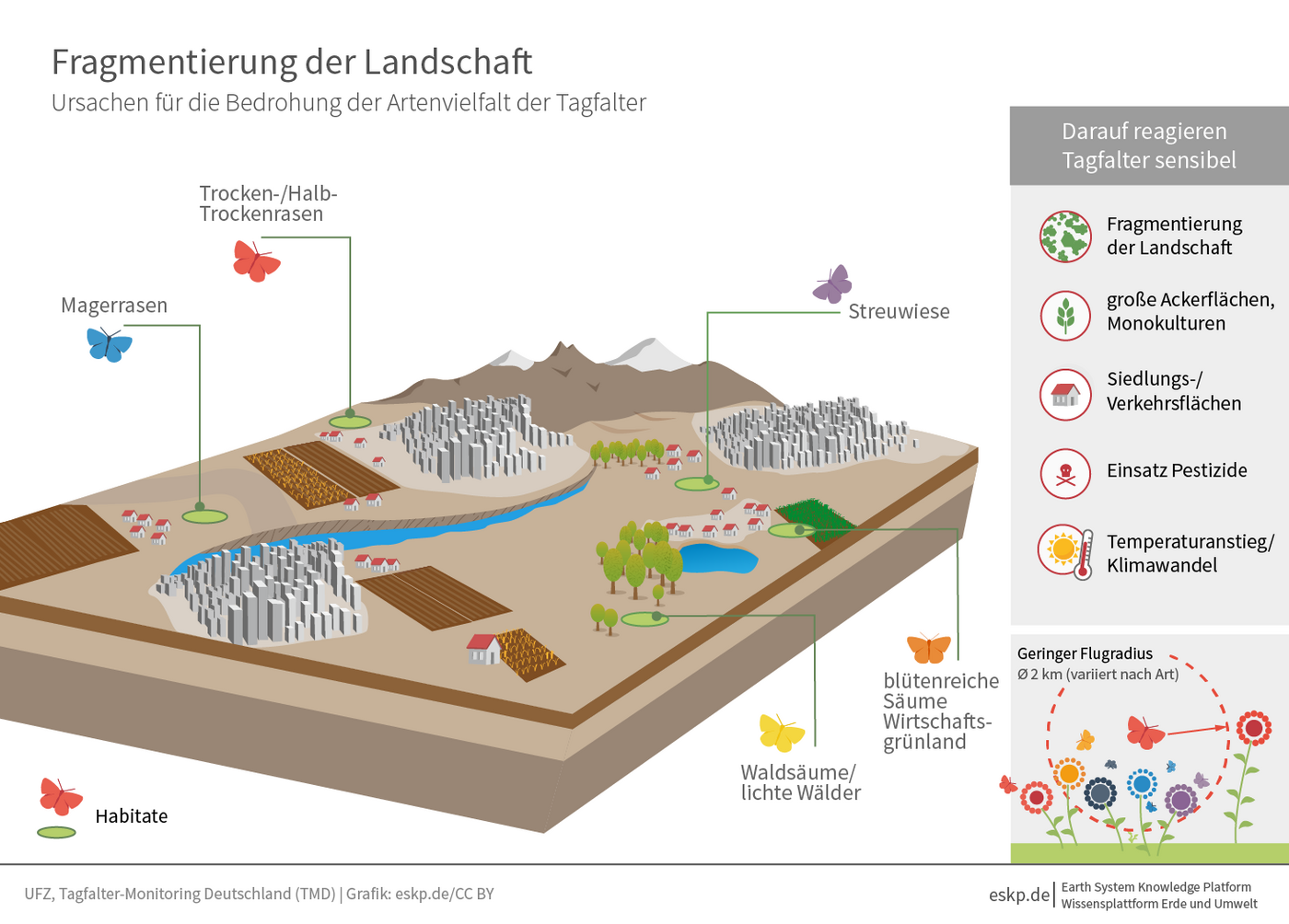 Habitate mit Blütenpflanzen oder Gräsern, die als Raupennahrung dienen, gehen oft mit einer Landnutzungsänderung verloren. Entscheidet ein Bauer, extensiv genutzte Wiesen und Weiden in Ackerland umzuwandeln oder werden täglich 69 ha Land (Durchschnitt von 2011-2014) neu versiegelt, hat das weitreichende Folgen. Aber auch in Wäldern und an Waldrändern finden sich immer weniger blühende Pflanzen, denn Aufforstung und Stickstoffeinträge aus der Luft machen sie viel dichter als noch vor 20 Jahren, und lassen Lichtungen verschwinden. Diese Landnutzungsänderungen haben einen noch stärkeren Einfluss als der Klimawandel auf die Zusammensetzung der Artengemeinschaften. Ein weiterer, wesentlicher Faktor für den Rückgang der Schmetterlinge ist die fortwährende Zerschneidung der Landschaft. Mit Hilfe von NATURA 2000, einem zusammenhängenden Netz an Schutzgebieten, will die EU entgegenwirken: europaweit grüne Korridore und Rückzugsorte schaffen, um wieder größere, zusammenhängende Populationen und den Austausch zwischen diesen zu ermöglichen.