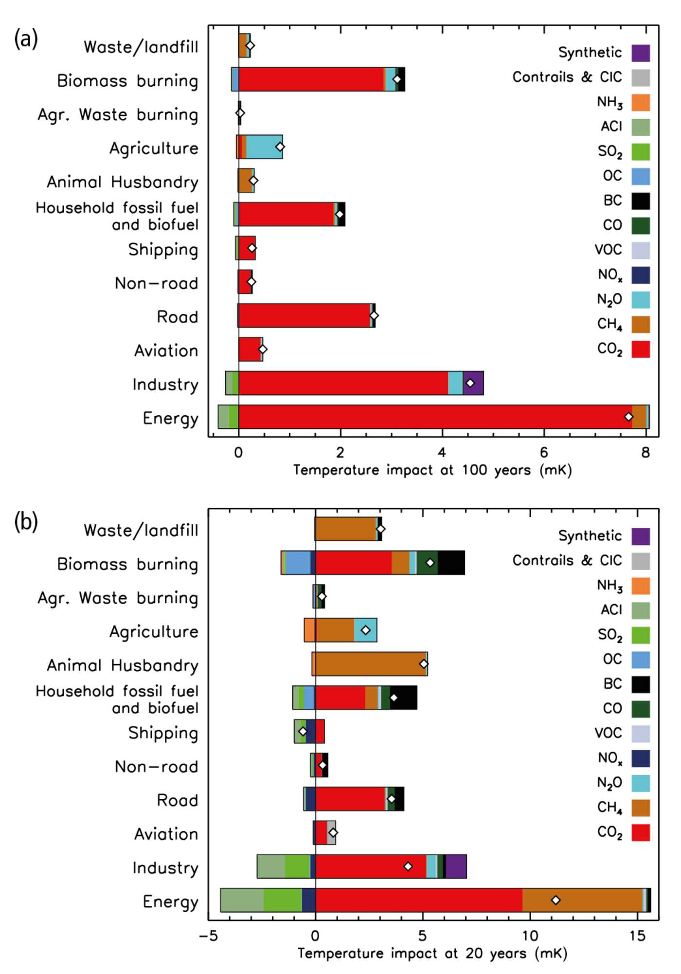 Zuwächse bei der deutschlandbezogenen Luftverkehrsnachfrage werden vom DLR vor allem im internationalen Geschäftsreiseverkehr und bei internationalen privaten Kurzreisen gesehen. Auf dem asiatischen Kontinent ist das Wachstum besonders rasant. Mehr als drei Milliarden Menschen fliegen bereits heute pro Jahr weltweit (Berster et al., 2015). Das Problem aus klimapolitischer Sicht: Manche Emissionen in Reiseflughöhe sind dreimal so wirksam wie der Ausstoß von Treibhausgasen in Bodennähe (Lee et al., 2009). Der CO2-Ausstoß hängt von vielen Faktoren ab: Flugphase, Fluglänge, Flugzeug- und Triebwerktyp bzw. der Auslastung. Aktuell trägt der Schiffs- und Flugverkehr circa 5 Prozent zum Klimawandel bei (UNFCCC, 2016). Der Schiffsverkehr und die daraus resultierenden Emissionen an Stickoxiden reduzieren zudem auch das Treibhausgas Methan. Es wird deshalb diskutiert, ob sich netto, zumindest auf einen 20 Jahres-Zeitraum betrachtet, ein Effekt im Schiffsverkehr ergibt, der einer Erwärmung entgegenwirkt. Nur langfristig wiegt CO2 stärker. Abbildung 1 zeigt die Verhältnisse im Detail. In rot ist der Beitrag des CO2 zur Erwärmung dargestellt.