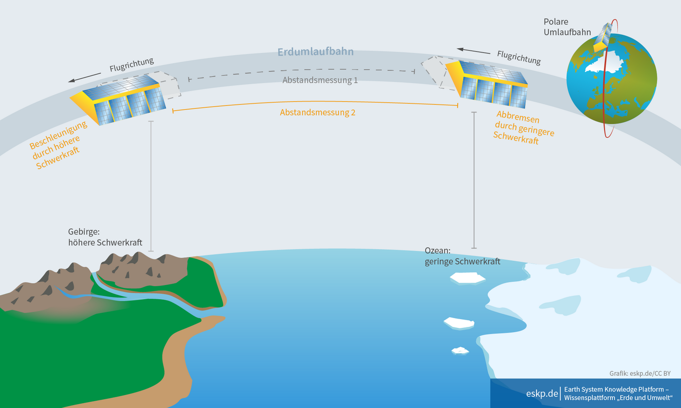 Die GRACE-Satelliten liefern wichtige Hinweise auf Auswirkungen des Klimawandels durch die kontinuierliche, monatliche Messung der Veränderungen des Erdschwerefeldes. Bei GRACE fliegen zwei Satelliten in einer Anfangsflughöhe von 500 km (heute 360 km) im Abstand von rund 220 km Entfernung voneinander um die Erde. Der tatsächliche Abstand der beiden baugleichen Satelliten ändert sich in Abhängigkeit von den Ungleichmäßigkeiten des Schwerefeldes der Erde. Fliegt der vordere Satellit über ein Gebiet mit stärkerer Schwerkraft, wird er zunächst kurzzeitig beschleunigt und anschließend wieder verlangsamt. Der hintere Satellit erfährt kurze Zeit später dieselbe Änderung seiner Geschwindigkeit. Mit einem Mikrowellensensor wird der sich ständig ändernde Abstand der beiden Satelliten mit einer Genauigkeit im Mikrometerbereich gemessen (weniger als eine Haaresbreite genau!). Aus den Abstandsänderungen und den Positionen der beiden Satelliten, welche mit GPS bestimmt werden, kann auf das Erdschwerefeld rückgeschlossen werden. Die Genauigkeit einer solchen monatlichen Schwerefeldlösung beträgt etwa 1 mm Fehler des Geoids bei einer räumlichen Auflösung von etwa 350 km. Hat man nun eine genügend lange Zeitreihe solcher Schwerefeldlösungen, können daraus wiederum Abschmelzraten von Eismassen (Gletscher, Polkappen), das Heben oder Senken von Landmassen durch die sogenannte post-glaziale Landhebung, Hochwasser oder Dürren und auch Meeresspiegeländerungen erfasst werden.