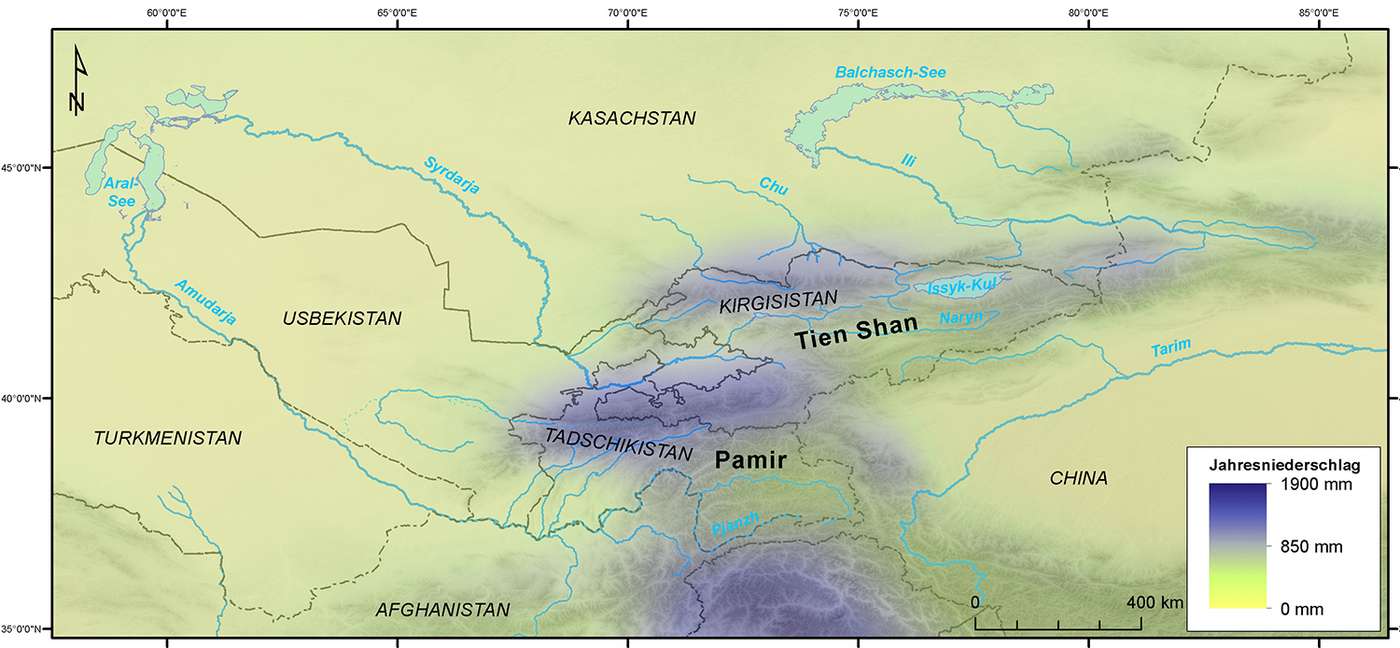 Die Flüsse Amudarja, Syrdarja und Tarim werden aus den zentralasiatischen Gebirgsregionen Tien Shan und Pamir mit vergleichsweise hohen Abflussspenden von mehr als 300 bis über 600 mm pro Jahr gespeist. Mehr als 70 % des Jahresabflusses der im Tien Shan und seinen Ausläufern liegenden Flussgebiete werden in über 3.000 Meter Höhe gebildet. Die Speicherung von Wasser als Eis und Schnee führt zu Abflussspitzen in den warmen Frühjahrs- und Sommermonaten. Von diesem Schmelzwasser profitiert in Zentralasien insbesondere die Landwirtschaft, die während der trockenen Sommermonate auf das Wasser angewiesen ist. Darüber hinaus kann in warmen und trockenen Jahren eine erhöhte Gletscherschmelze ausbleibende Niederschläge lokal teilweise kompensieren und für einen Basisabfluss sorgen.