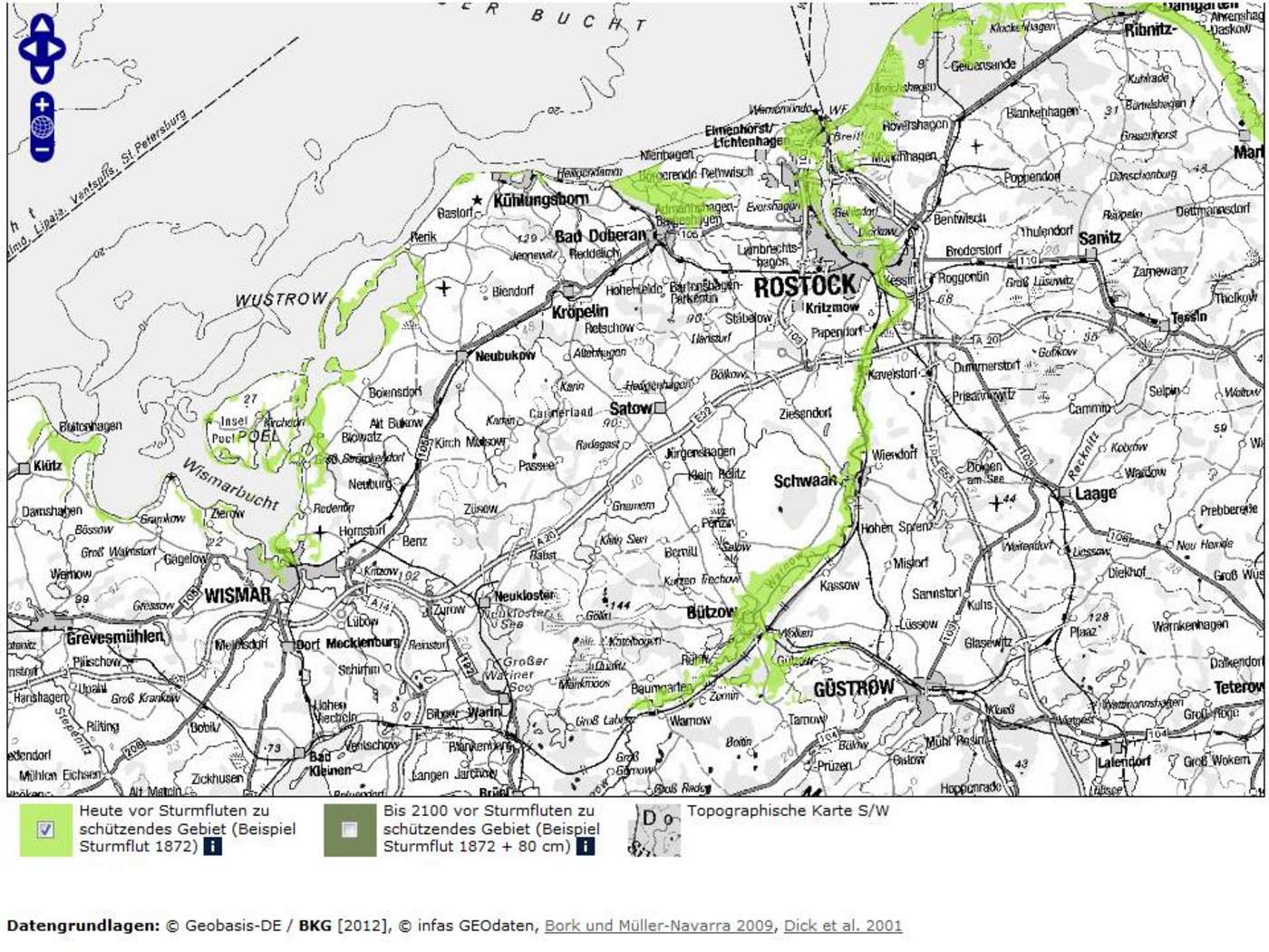 Die obere Karte zeigt auf der Basis der Sturmflut vom 12. / 13. November 1872, in welchen Regionen der deutschen Ostseeküste Küstenschutzbedarf besteht (hellgrüne Gebiete). Zudem können die voraussichtlich bis Ende des 21. Jahrhunderts zu sichernden Gebiete angezeigt werden. Bis dahin können hohe Sturmfluten, wie beispielsweise die Sturmflut vom 12. / 13. November 1872, durch den Meeresspiegelanstieg bis zu 80 cm höher auflaufen.