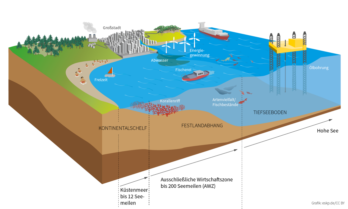 Für den größten Teil des Ozeans, der Hohen See, gilt weitgehend die Freiheit der Meere. Allerdings ist nicht mehr alles erlaubt. Dennoch immer noch sehr viel. Der Meeresboden hingegen gilt als Allgemeingut. Im Vergleich zur Gesamtfläche liegen nur kleine Küstenbereiche in den Hoheitsgewässern (12 Seemeilenzone) bzw. Wirtschaftszonen (200 Seemeilenzone) der jeweiligen Anrainerstaaten. Dennoch bedarf es oftmals zäher Verhandlungen, verbindliche Abkommen zum Schutz des Meeres innerhalb und außerhalb der Wirtschaftszonen auszuhandeln. Zahlreiche Interessensgruppen aus Politik und Wirtschaft ringen sowohl national als auch international um Umweltschutzstandards, Fischfangquoten und -methoden, Artenschutz, Fördergenehmigungen oder Transportrouten und Durchfahrtsrechte. Aber selbst, wenn die Rechtslage vorhanden ist, fehlt es oft an Möglichkeiten, die Abkommen umzusetzen. Häufig fehlen die Kapazitäten zur Kontrolle und Sicherung.