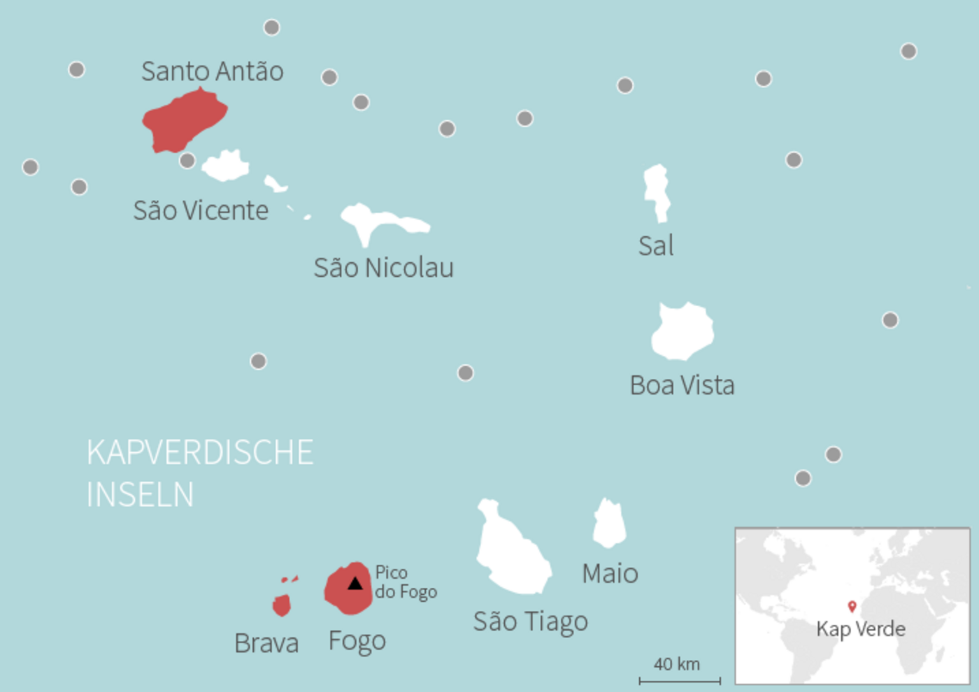 Seit Ende November ist der Vulkan Fogo aktiv. Lavafontänen, Lavaströme sowie Ausstoß von Gasen und pyroklastischem Material sind typisch für solch eine Strombolianische Eruption. Sie kommen hier etwa alle 20 Jahre vor. Und Fogo ist nur eine der zehn Kapverdischen Inseln, die jüngste, und auch die aktivste. Ein heißer Fleck im Erdmantel ist Ursache für seine Aktivität.