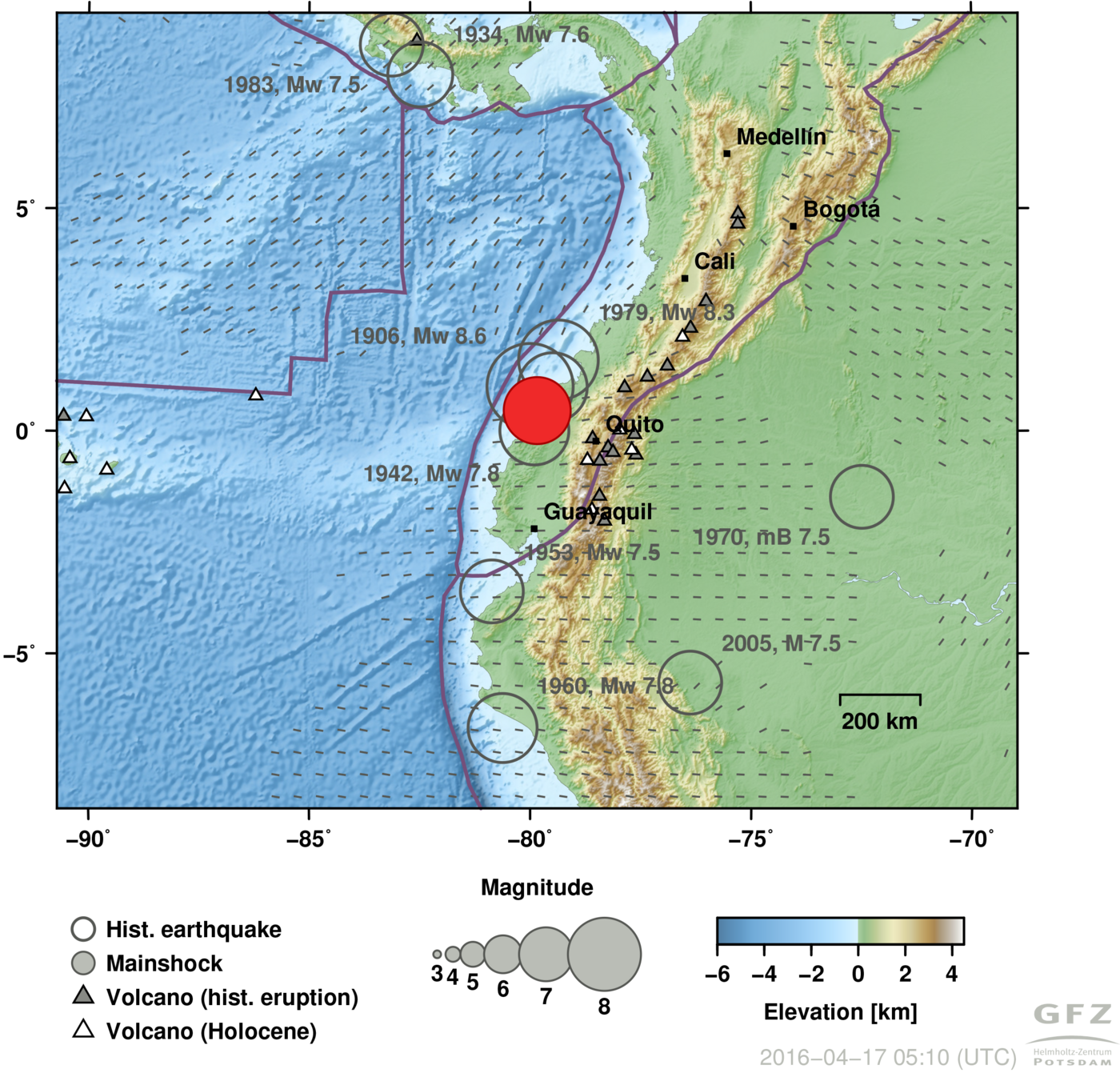 Die Gefährdungskarte zeigt im Bereich der Küste vor Ecuador und entlang der tekonischen Scherzone Dolores-Guayaquil Megashear in den Anden eine hohe seismische Gefährdung mit zu erwartenden Beschleunigungen von über 4-5m/s2 (10%-ige Übertretenswahrscheinlichkeit innerhalb von 50 Jahren). Aufgrund der hohen Konvergenzrate zwischen der Nazca- und Südamerika-Platte sind Megathrust-Beben in Südamerika besonders häufig. So trat das bisher stärkste, instrumentell aufgezeichnete Erdbeben mit einer Magnitude von MW 9,5 an dieser Plattengrenze in Südchile auf. Innerhalb eines Bereiches von 250 km von dem MW 7,7 Beben vom 16. April 2016 sind in den letzten 100 Jahren 7 weitere Beben mit MW > 7 aufgetreten.
