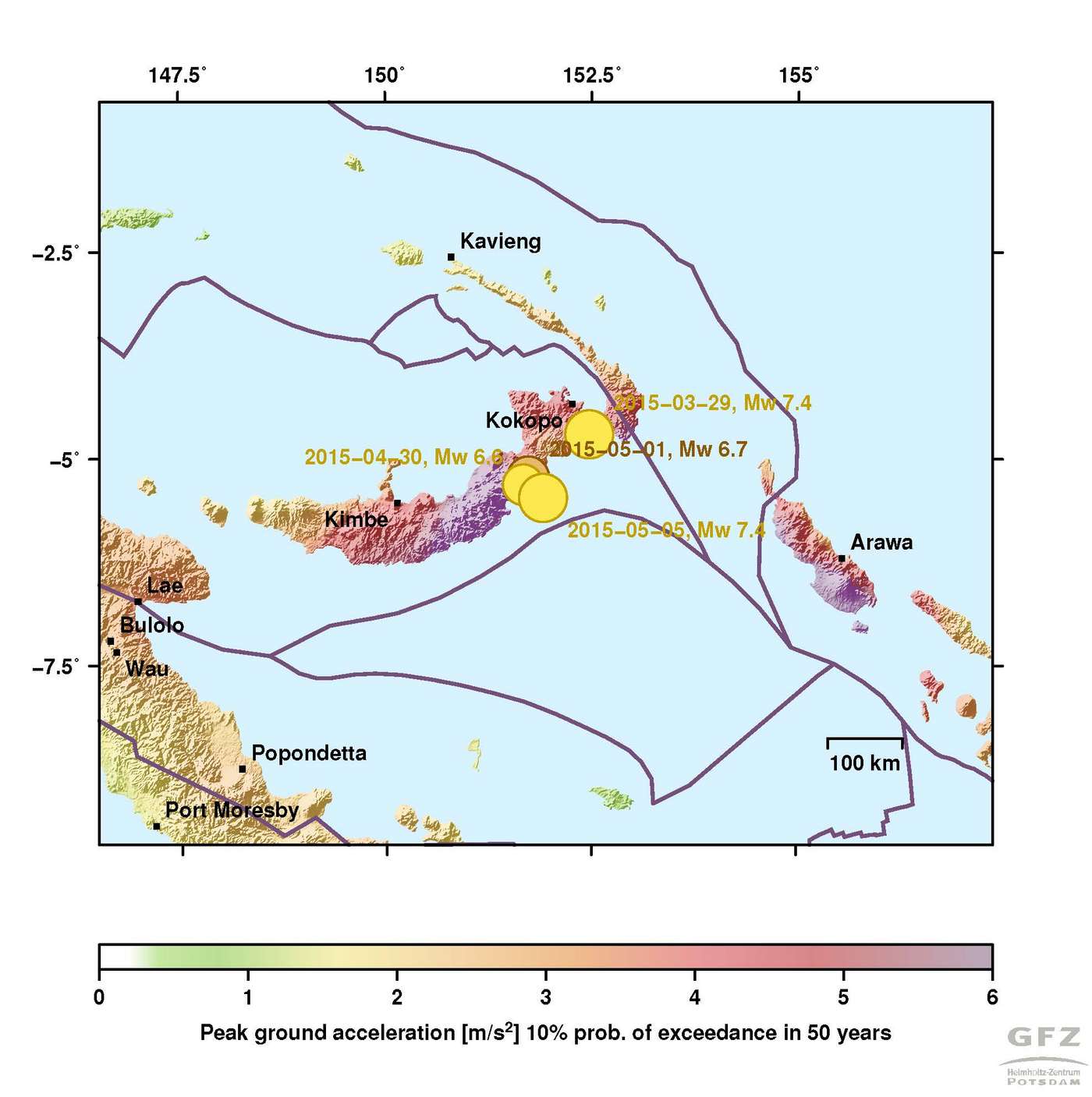 Die Inseln Neubritannien und Papua Neuguinea liegen insgesamt in einer Region hoher seismischer Gefährdung (siehe Abb. rechts). Die Nachbebenaktivität des M7,4 Bebens vom 29. März 2015 hat bis zum 5. Mai etwa doppelt so viele Nachbeben wie eine durchschnittliche Nachbebenaktivität erzeugt. Dennoch kann die Abklingrate noch als normal beurteilt werden (der Omori-Exponent ist p=1). Die letzten drei großen Erdbeben (M6,6 am 30. April , M6,7 am 1. Mai und M7,4 am 5. Mai 2015), die als Teil dieser Sequenz aufgefasst werden können, lösen nun ihre eigenen lokalen Nachbebensequenzen aus.