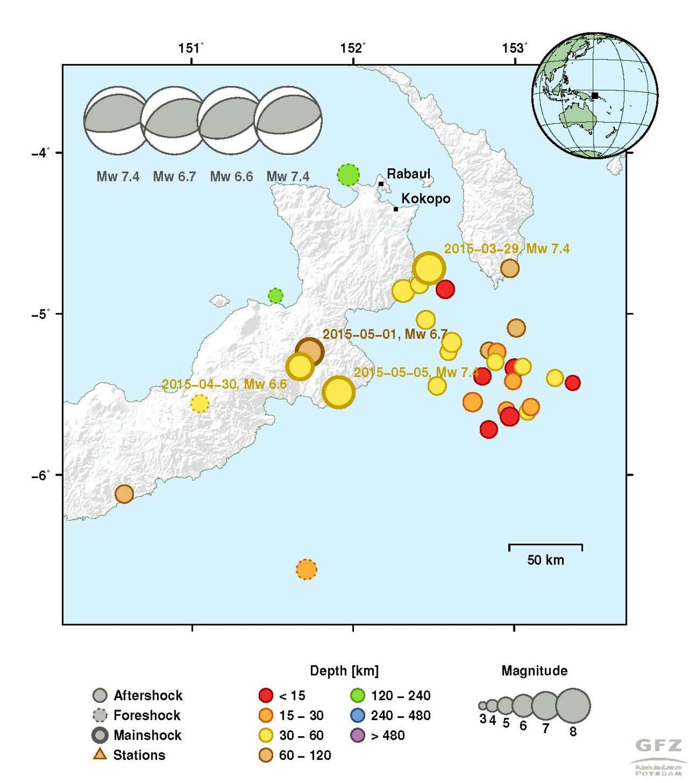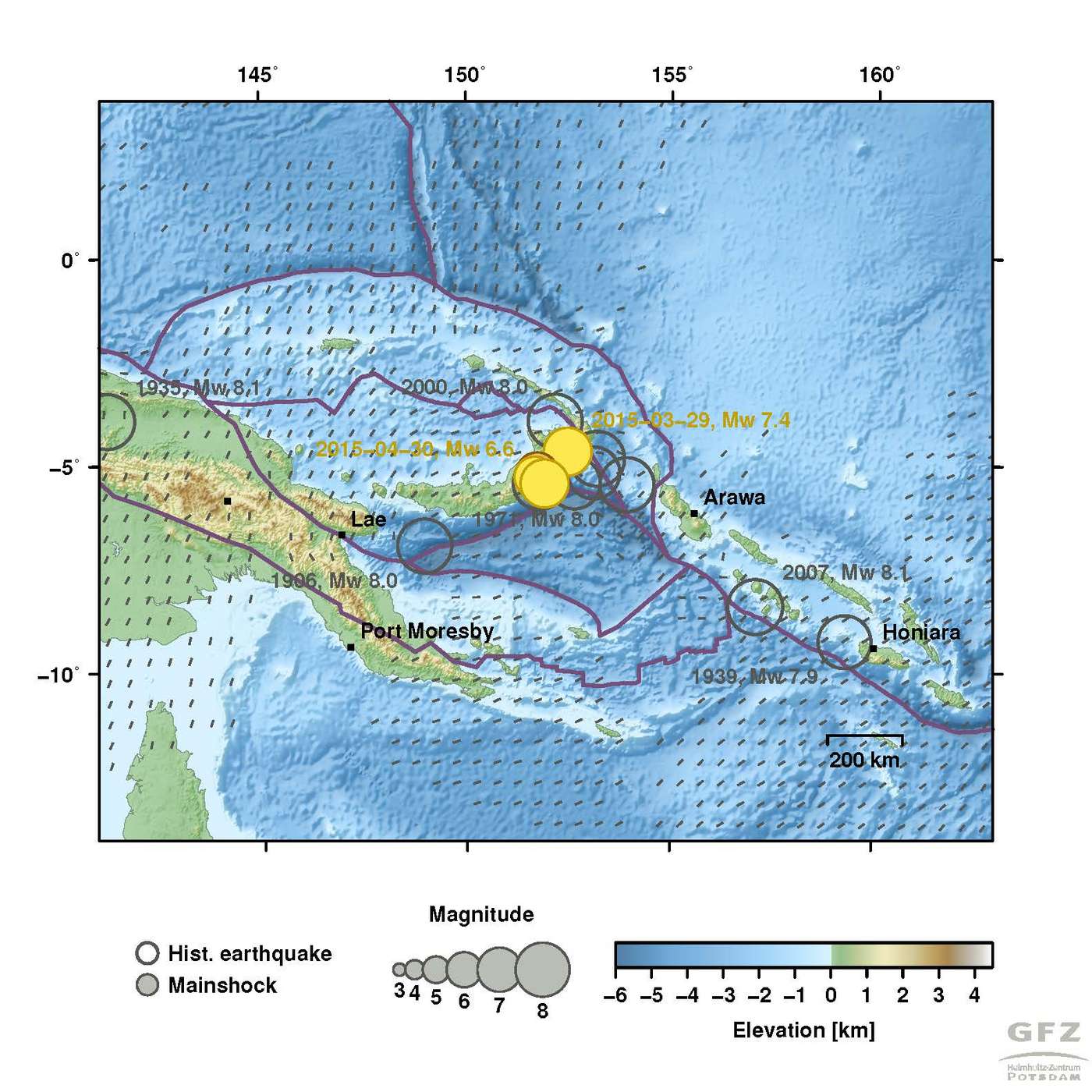 Am 29. März 2015 trat an der Südostküste Papua-Neuguineas ein Erdbeben mit der Magnitude M7,4 in 34 km Tiefe auf. Das Ereignis löste eine überdurchschnittlich starke Nachbebensequenz aus, in deren Folge bis zum 7. Mai 2015 drei weitere Starkbeben mit Magnituden M 6,6, M6,7, M7,4 und M7,0 auftraten. Das Beben am 5. Mai hatte einen schwachen, lokalen Tsunami ausgelöst.