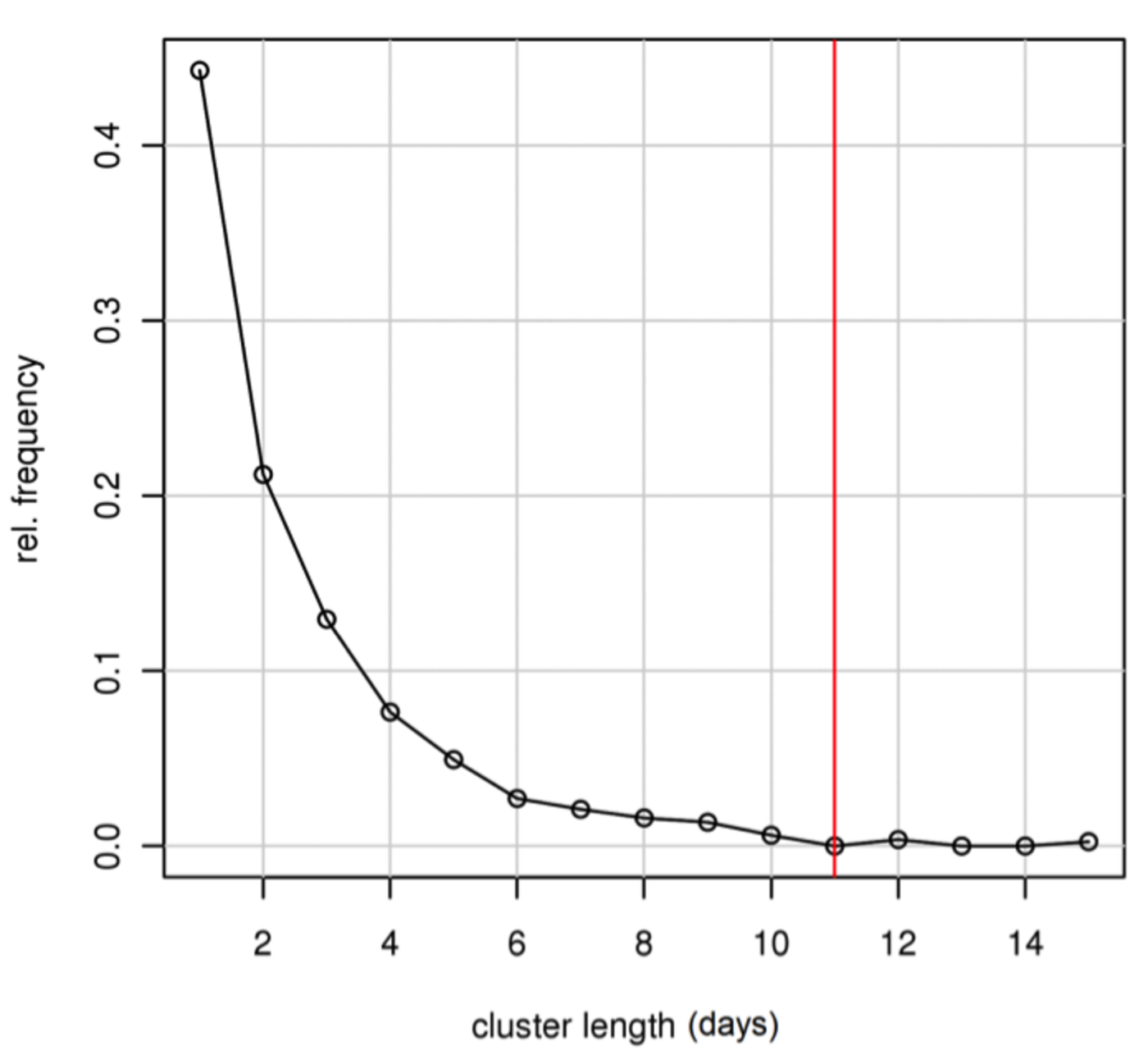 Wissenschaftler des Instituts für Meteorologie und Klimaforschung (IMK-TRO) und des Centers for Disaster Management and Risk Reduction Technology (CEDIM) am Karlsruher Institut für Technologie (KIT) haben diese Unwetterperiode aus meteorologischer Sicht analysiert (Piper et al., 2016). Ein Ziel ihrer Studie war es, die Persistenz, also die Andauerneigung, der gewitterträchtigen Bedingungen in Bezug auf einen 55-jährigen Referenzzeitraum zu bewerten. Den Analysen zufolge konnten Cluster mit 10 aufeinanderfolgenden Tagen, an denen in einer beliebigen Region in Deutschland Extremniederschläge fielen, im Referenzzeitraum bisher nur dreimal beobachtet werden1. Ähnliches gilt für die Kombination von geringer atmosphärischer Stabilität und geringer Windgeschwindigkeit in mittleren Höhen. Ein 13-tägiges Cluster, wie im Mai/Juni 2016 zu beobachten war, kam im 55-jährigen Kontrollzeitraum insgesamt nur zweimal vor2. Weiterhin haben die Forscher ein indirektes, auf mehreren Variablen basierendes (multivariates) Verfahren entwickelt und auf Daten eines Reanalysemodells angewendet (CoastDatII vom Helmholtz-Zentrum Geesthacht). Mit dem Modell lässt sich die Gewitterneigung für jeden Tag seit 1960 bestimmen. Für die Unwetterperiode 2016 selbst ergibt sich eine Aneinanderreihung von 11 solcher konvektiven3 Tage. Aus der statistischen Evaluierung des gesamten Referenzzeitraums folgt, dass die Wahrscheinlichkeit für solch eine Gewitterserie bei weniger als 1% liegt (Abb. 2).