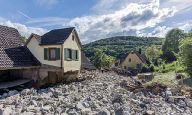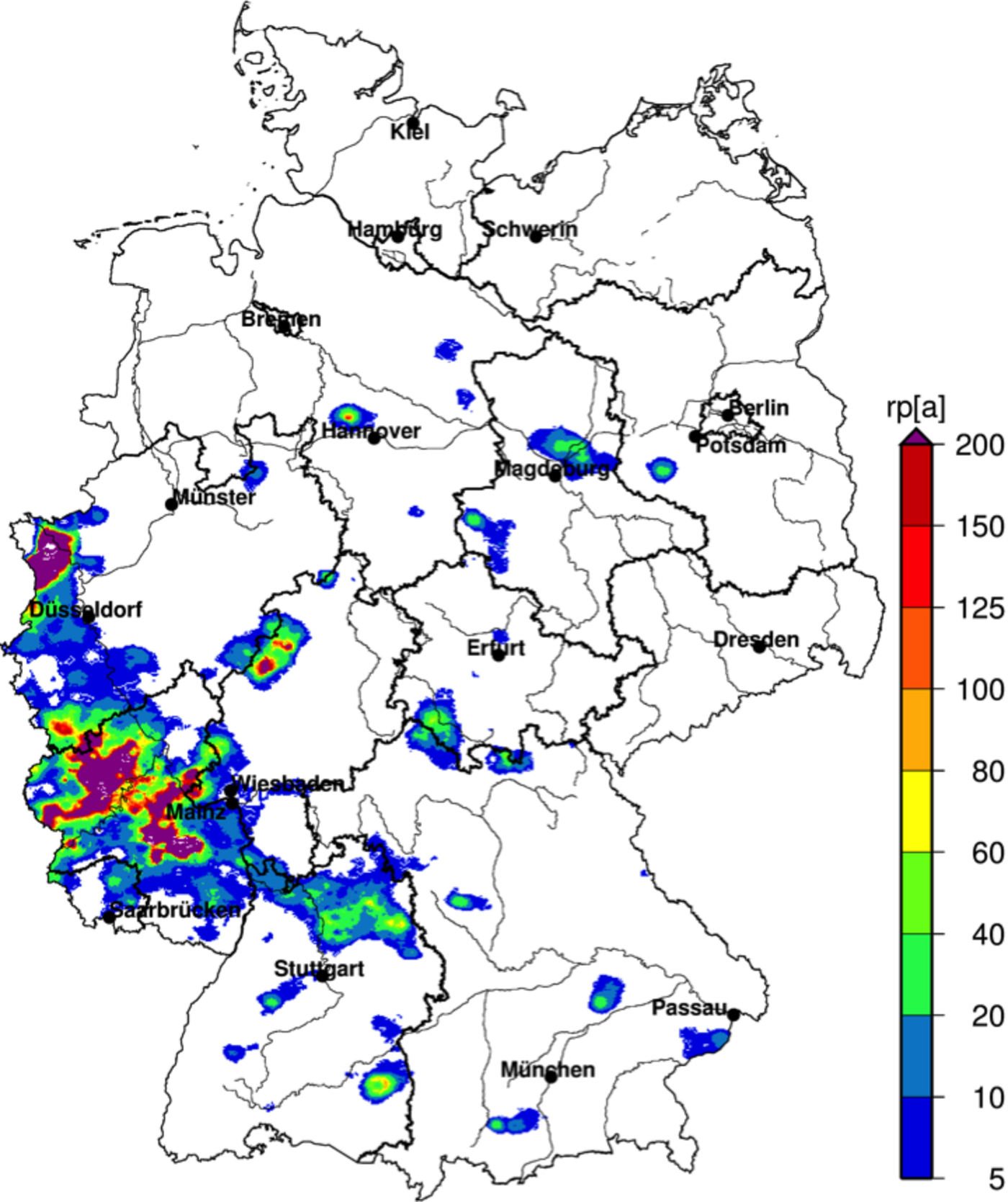 Über einen Zeitraum von zwei Wochen hinweg kam es im Mai und Juni 2016 in weiten Teilen Deutschlands wiederholt zu schweren Gewittern, die hohe Schäden nach sich zogen und sogar mehrere Todesopfer forderten. Extreme Regenmengen von mehr als 100 mm in wenigen Stunden führten dazu, dass kleine Bäche dramatisch anschwollen und binnen kürzester Zeit ganze Ortschaften überfluteten. Die Episode schadenträchtiger Unwetter setzte am 29. Mai in Braunsbach (Baden-Württemberg) ein, wo eine Flutwelle von bis zu 3,5 m Höhe über 80 Gebäude beschädigte, von denen fünf vollständig zerstört wurden. Nur drei Tage später kam es in Simbach am Inn (Bayern) zu schweren Überflutungen, nachdem der örtliche Pegel innerhalb von nur zwölf Stunden von 20 cm auf mehr als 5 m angestiegen war. Das Ahrtal im nördlichen Rheinland-Pfalz war sogar an mehreren Tagen von heftigem Starkregen betroffen, wie die Karte der maximalen 7-tägigen Regensumme zeigt (Abb. 1), und erlebte in der Folge das schlimmste Hochwasserereignis seit Beginn der Aufzeichnungen. Extremwertanalysen bezüglich 24-stündiger und siebentägiger Niederschlagssummen ergaben lokale Wiederkehrperioden von über 200 Jahren, an manchen Orten sogar weit darüber. Dies bedeutet, dass es sich um mehr als sogenannte Jahrhundertereignisse handelte. Alle Ereignisse in Deutschland zusammengenommen, beläuft sich der Schaden auf 1,2 Milliarden Euro (GDV, 2016).