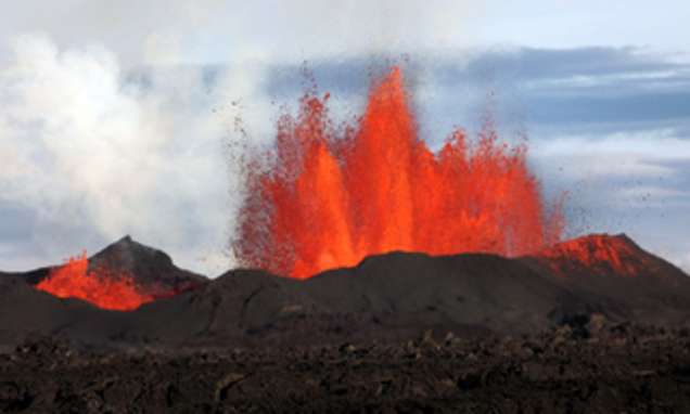 Schildvulkan, Mauna Kea auf Hawaii: Er ist derzeit nicht aktiv und gilt als schlafender Vulkan. So wie die anderen Vulkane auf Hawaii ist er auf einen Hot Spot entstanden. Ein Hot Spot ist eine "Heißer Fleck", er liegt unter der sich langsam bewegenden Pazifischen Platte im Erdmantel. Dort aufsteigendes Magma ist sehr siliziumarm und dünnflüssig. Durch kontinuierliche Aktivität des Vulkans seit 700.000 Jahren wuchs er bald über den Meeresspiegel hinaus. Auf dem Gipfel befindet sich das Astronomische Observatorium.