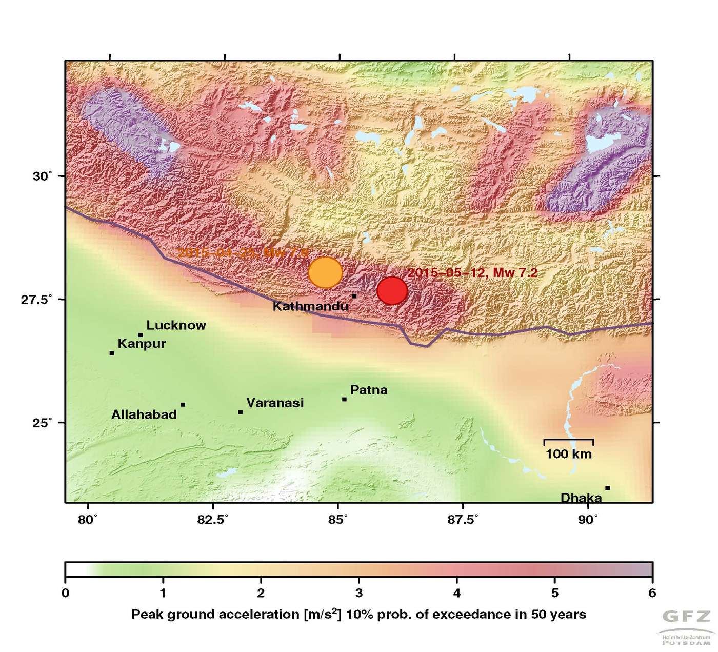 Seismische Gefährdung: Die Kollision und Unterschiebung der Indischen unter die Eurasische Platte erzeugt häufig Starkbeben in geringer Tiefe und stellt damit eine signifikante seismische Gefährdung dar. Die seismische Gefährdungskarte zeigt im Bereich des 25. April Mw 7,8 Bebens und auch für das Mw 7,2 Nachbeben vom 12. Mai die größten statistisch erwarteten Bodenbeschleunigungen mit 5m/s2, die mit 10%-iger Wahrscheinlichkeit innerhalb von 50 Jahren überschritten werden könnten (Gefährdungskarte stellt die Abschätzung vor dem Beben dar).