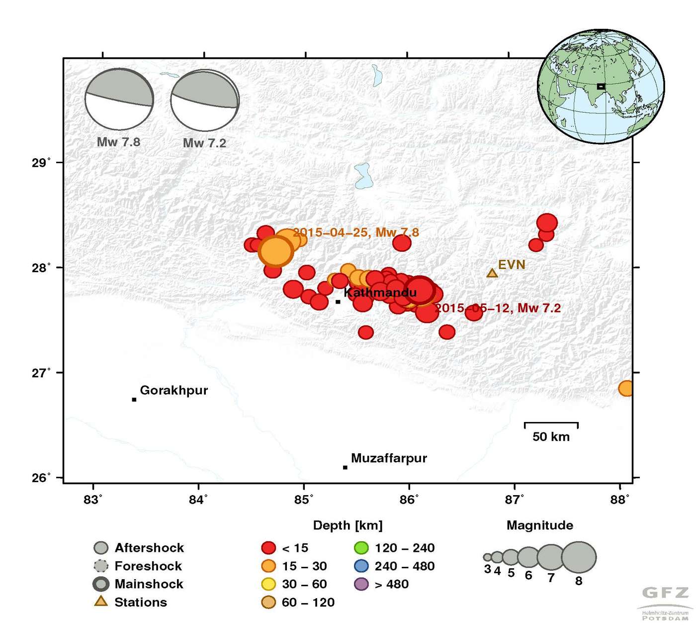 Zwei Starkbeben mit Magnituden Mw 7,8 und Mw 7,2 erschütterten die Region um die Millionenstadt Kathmandu, Nepal am 25. April und am 12. Mai 2015. GEOFON (GEoFOrschungsNetzwerk, GFZ) gibt die Tiefe der Beben mit 18 bzw. 15 km an. Herdflächenlösungen deuten auf nahezu horizontale Bruchflächen hin. Das Epizentrum des Hauptbebens (Mw 7,8, 25. April) wurde etwa 80 km nordwestlich von Kathmandu lokalisiert und die Nachbebenverteilung deutet darauf hin, dass sich der Bruch bis zu 150 km nach Osten ausgebreitet hat. Das Epizentrum des Magnitude MW 7,2 Bebens, am 12. Mai wurde am östlichen Rand der Nachbebenverteilung des ersten Hauptbebens lokalisiert. Trotz seiner Größe kann man das Beben vom 12. Mai als Nachbeben des Bebens vom 25. April bezeichnen.