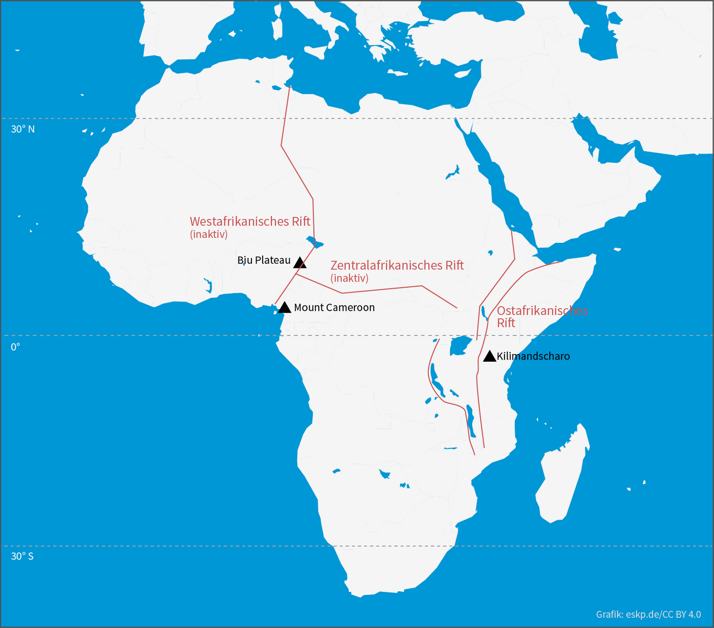 Afrika besteht aus mehreren kleineren Platten, die über ehemalige Kollisionszonen miteinander verbunden sind. Im Ostafrikanischen Rift wurde solche eine Sollbruchstelle bereits reaktiviert, aber im Westafrikanischen und im Zentralafrikanischen Rift, die beide vor 130 Millionen Jahren aktiv waren ohne sich zu einem Ozean zu öffnen, bleibt diese Möglichkeit weiterhin erhalten.
