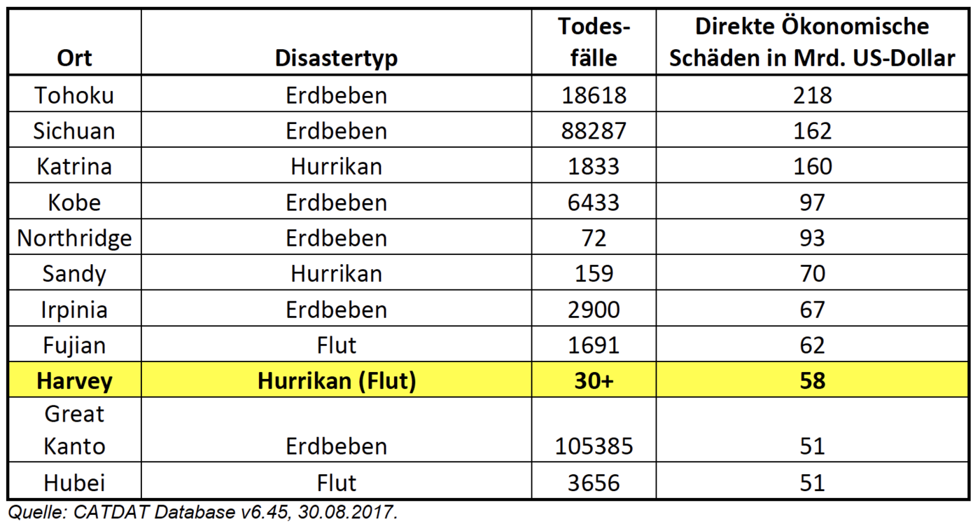 Nahezu 30 % der Fläche des Harris County, in dem auch Houston liegt, standen unter Wasser. Die Metropolregion Houston erlebte in den vergangenen Jahrzehnten eine rasante Entwicklung, und mit über 4,5 Millionen Einwohnern liegt Harris County der Einwohnerzahl nach auf Platz 3 der USA. Forscher des Center of Disaster Management and Risk Reduction Technology (CEDIM), einer interdisziplinären Forschungseinrichtung des Karlsruher Instituts für Technologie im Bereich des Katastrophenmanagements, schätzen die zu erwartenden Schäden auf 58 Milliarden US-Dollar – allein für Texas. Damit gehört Harvey schon jetzt zu den zehn teuersten Naturkatastrophen seit dem Jahr 1900 weltweit. Und die Kosten könnten je nach Wetterentwicklung noch bis auf über 80 Milliarden steigen.