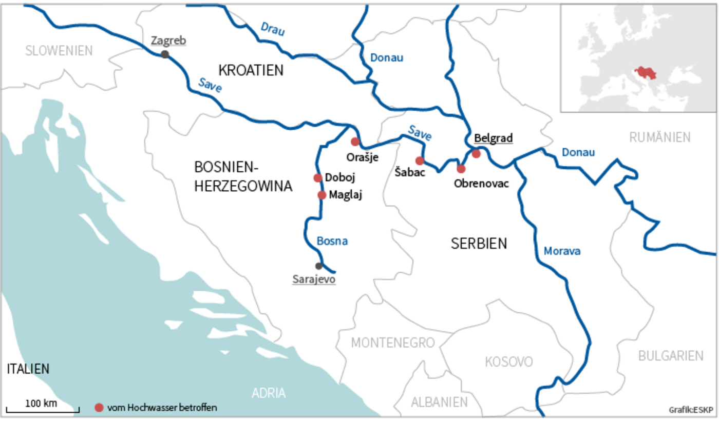 Niederschlagsmengen von vielerorts über 200 mm innerhalb 72 Stunden, wie zum Beispiel in Tuzla (Bosnien-Herzegowina), wo bis zum 16. Mai 2014 fast 234 mm Regen fielen, ließen viele Bäche und Flüsse stark anschwellen und führten in Serbien und in Bosnien-Herzegowina zu einer enormen Flut. Besonders stark betroffen war der Fluss Save in Kroatien, Bosnien-Herzegowina und Serbien sowie die Bosna (Bosnien-Herzegowina). Ganze Landstriche und Städte, wie die Städte Doboj, Samac und Maglaj in Bosnien-Herzegowina oder die serbische Stadt Obrenovac, standen zum Teil unter Wasser.