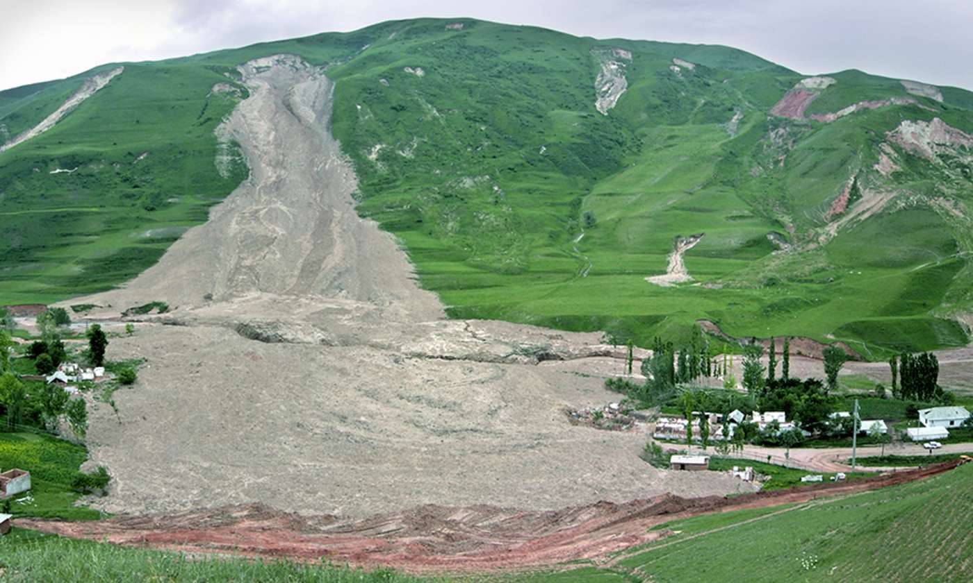 Rund zwei Millionen Kubikmeter Erd-und Gesteinsmassen haben sich am 26. April 2004 an einem Hang unweit des Dorfes Kainama im Süden Kirgistans gelöst. Große Teile der Ortschaft wurden bei dem Unglück verschüttet, 33 Menschen fanden den Tod. Das Volumen der abgerutschten Massen entspricht in etwa dem Fassungsvermögen von zwei Millionen vierrädrigen Hausmüllcontainern.