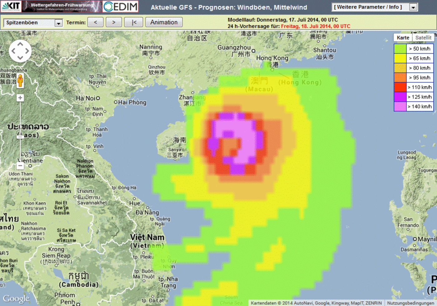 Ein Bericht von CEDIM (Center for Disaster Management and Risk Reduction Technology; Kooperation des Deutschen GeoForschungsZentrums, GFZ und dem Karlsruher Institut für Technologie, KIT) zum Verlauf des Taifuns finden Sie hier.