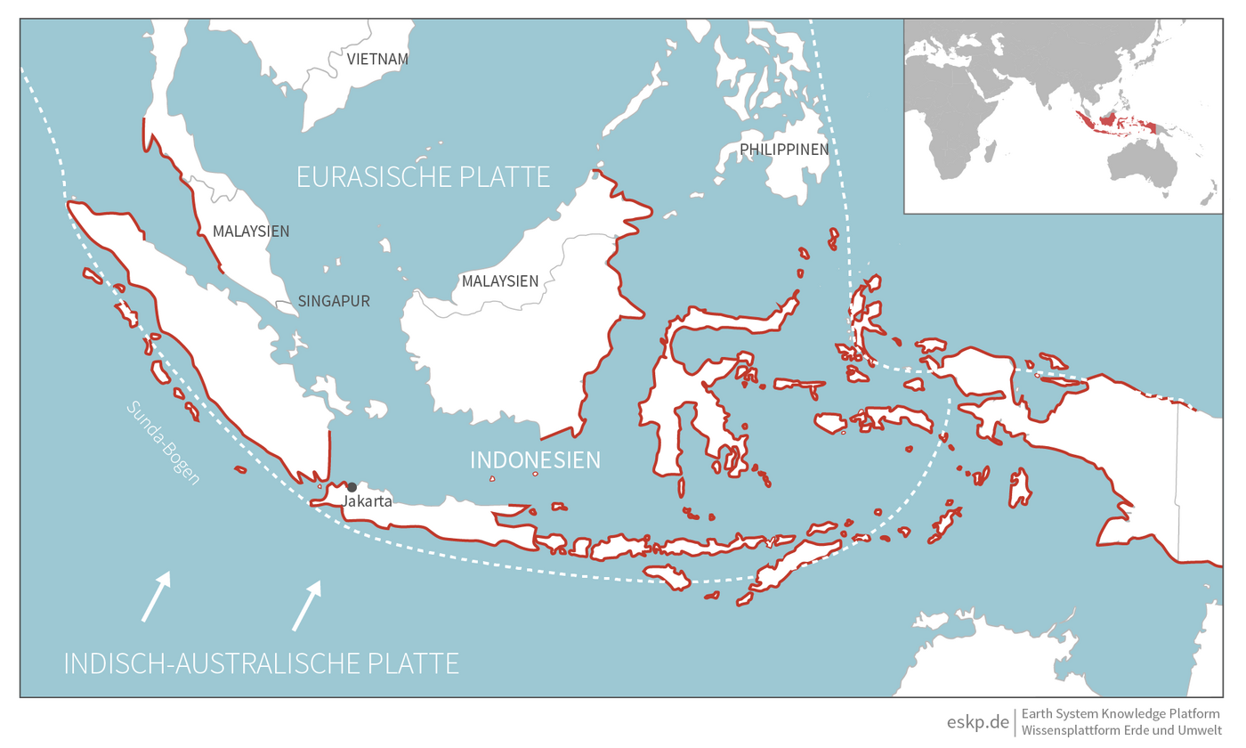 Der Sundagraben, wo die starken Beben untermeerisch entstehen, erstreckt sich bogenförmig von der Nordwestspitze Sumatras bis zur Insel Flores im Osten Indonesiens über eine Länge von rund 5.000 Kilometern. Entsteht hier ein Tsunami, laufen die Wellen im Extremfall innerhalb von 20 Minuten an der Küste auf, sodass nur sehr wenig Zeit für eine Frühwarnung und Evakuierung bleibt. Noch kürzer ist die Reaktionszeit auf vielen Inseln Indonesiens. Dort bleiben häufig nicht einmal fünf Minuten zwischen Beben und Tsunami.