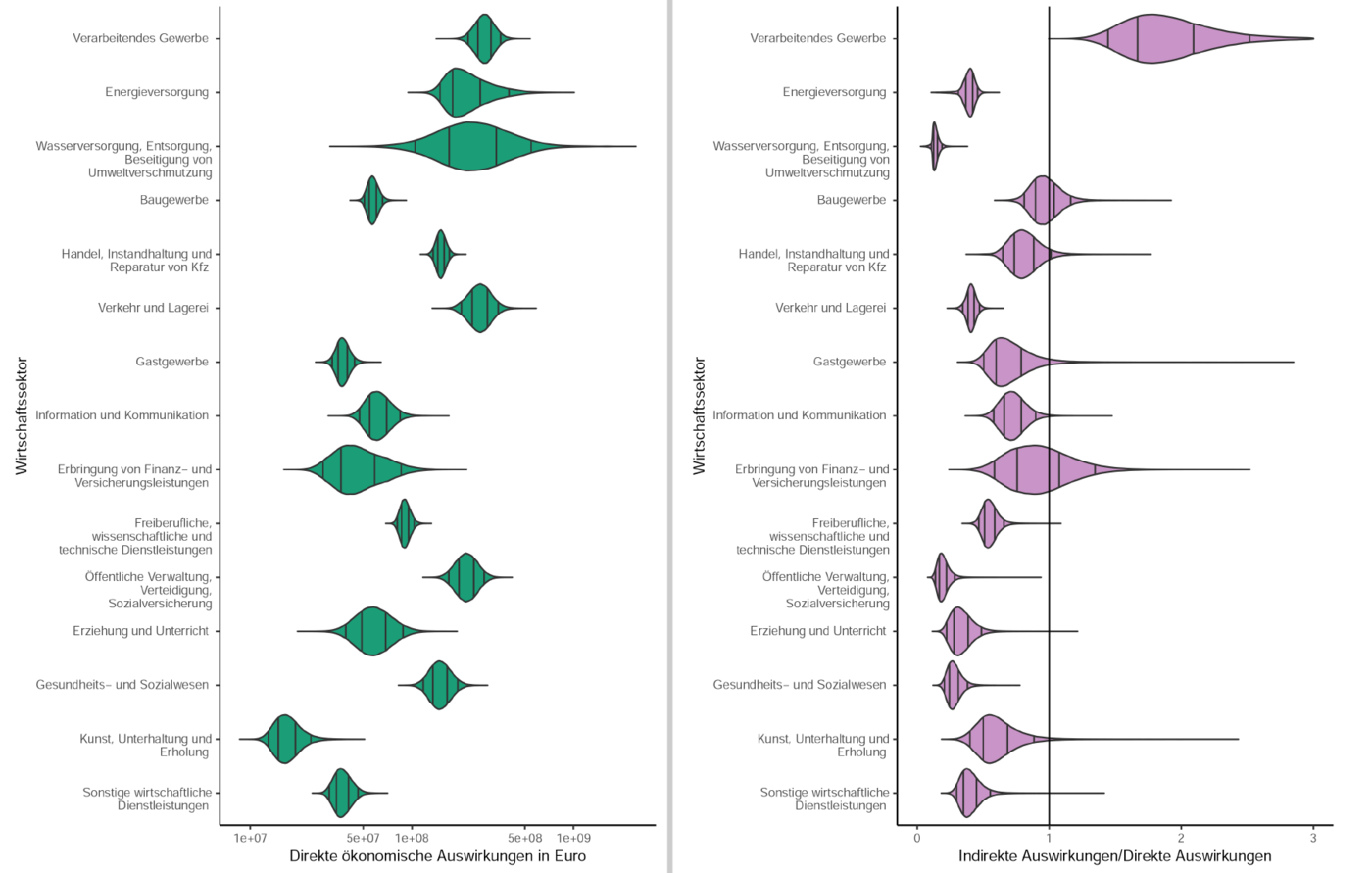 Mit der jetzt zur Verfügung stehenden Methode lassen sich zusätzlich Aussagen darüber treffen, welche Wirtschaftssektoren eher direkt (Abb.2) oder aber indirekt betroffen ist. So zeigen die Modelle beispielsweise, dass der Dienstleistungssektor im Verhältnis weniger von indirekten Auswirkungen betroffen als die verarbeitende Industrie (Abb.3). Grund hierfür sind unter anderem die großen Abhängigkeiten der Unternehmen der verarbeitenden Industrie von einer funktionierenden Infrastruktur. Bezogen auf alle untersuchten Wirtschaftssektoren zeigen die Ergebnisse interessanterweise jedoch, dass direkte und indirekte Auswirkungen kurz nach einem Hochwasser beinahe gleich groß sind. Diese Informationen können zum Beispiel im Krisenmanagement während oder kurz nach einem Hochwasserereignis verwendet werden.