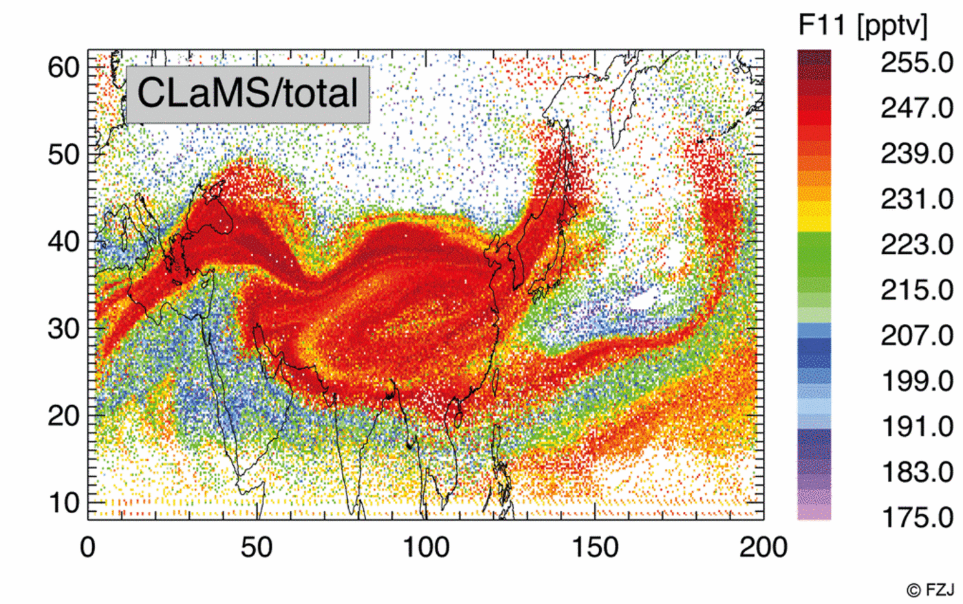 Die Horizontalverteilung von FCKW (F11) wurde vom Forschungszentrum Jülich mit dem Chemie-Transport-Modell (CLaMS) für den 9. August 2003 in etwa 18 km Höhe berechnet.
