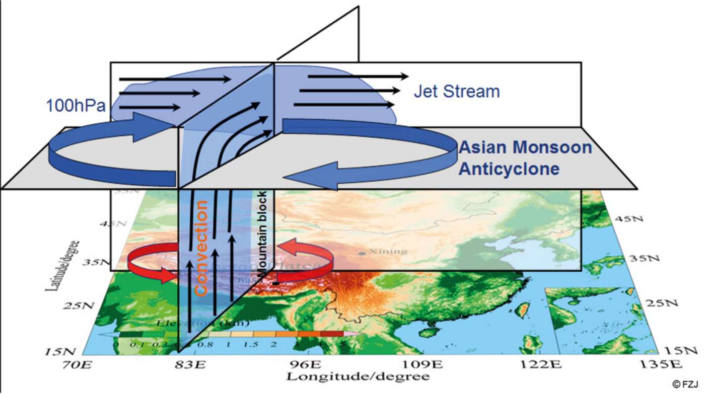 Eine schematische Beschreibung der atmosphärischen Zirkulation findet sich in Abbildung 1. Während die Troposphäre durch eine zyklonare Strömung (Tiefdruckgebiet) charakterisiert ist (rot, gegen den Uhrzeigersinn), die sich auch durch starke Monsunniederschläge auszeichnet, stellt sich in der oberen Troposphäre und in der unteren Stratosphäre eine stabile, antizyklonale (Hochdruckgebiet) Bewegung ein (blau, mit dem Uhrzeigersinn). Dieses dauerhafte Zirkulationsmuster bindet anthropogene Schadstoffe ein, die bis in die Stratosphäre befördert werden.